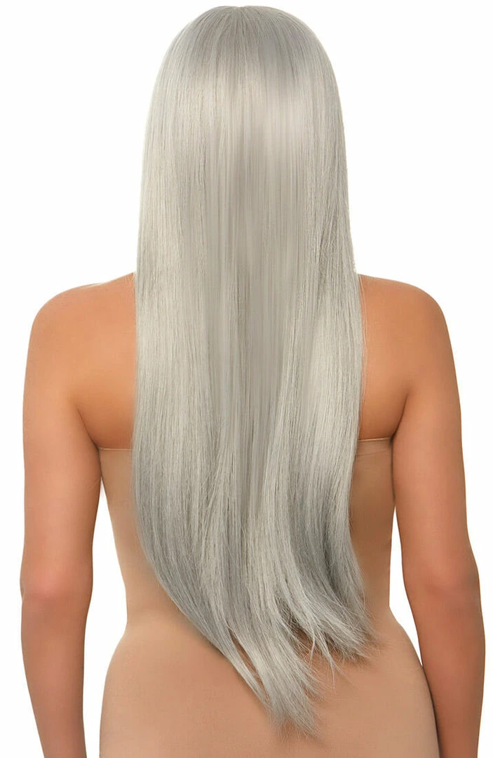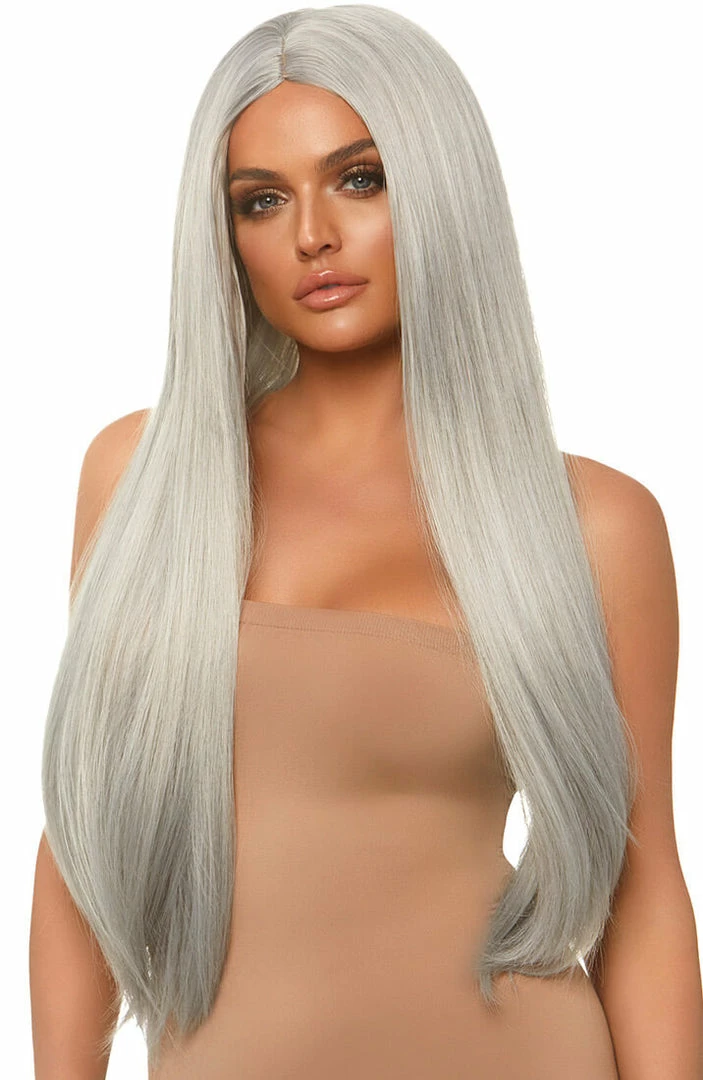 Extra long straight center part silver blond wig. Adjustable and stretchy wig cap for the perfect fit.