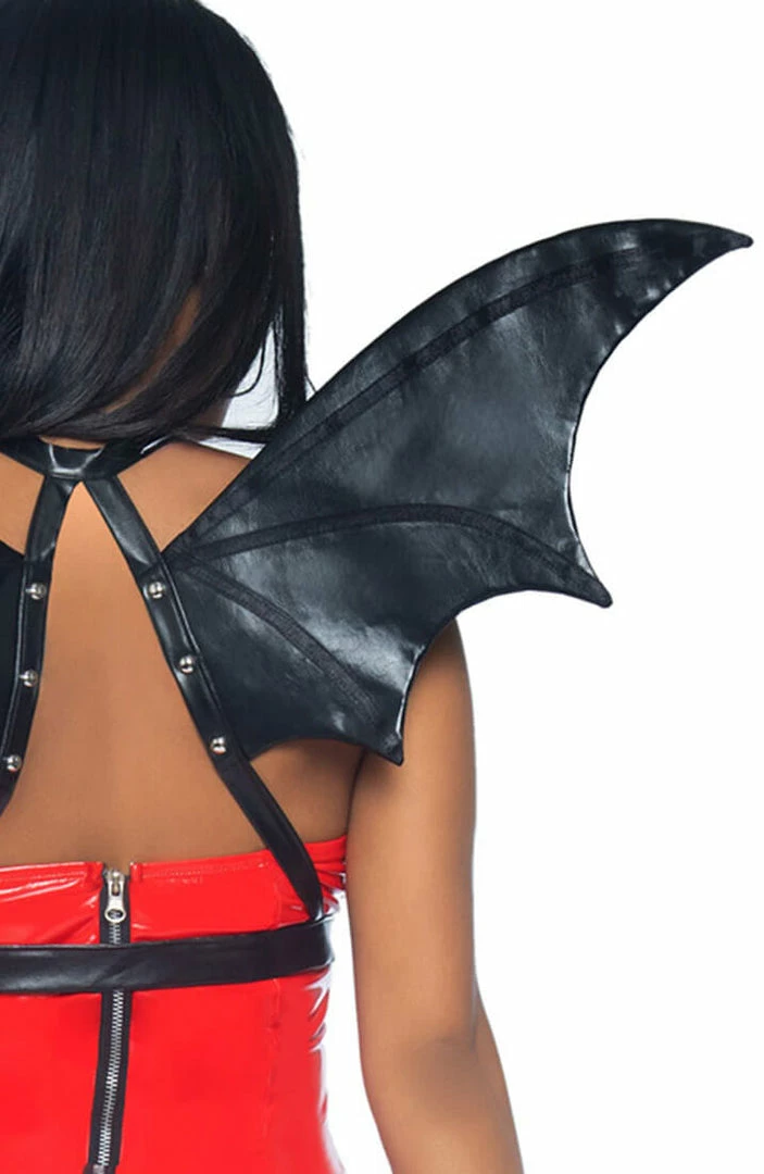 Take your Halloween outfit to wicked new heights with this black faux leather bat wing body harness.