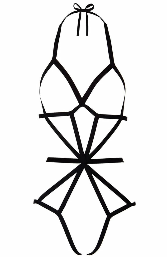 Sexy black crotchless bodystocking in soft stretchy nylon material, and an at least equally sexy black body harness, that can be used under, as well as, over the catsuit – the two styles can also be used separately.