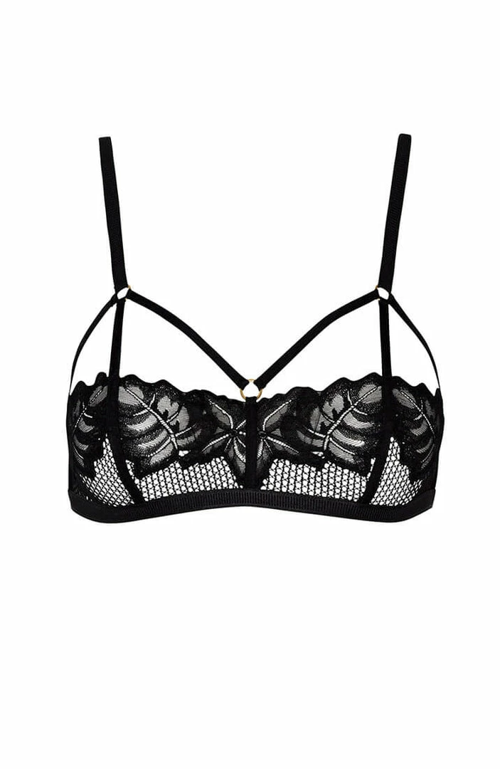 Exclusive black bralette in delicate leaf lace, small fence net, sheer mesh and sensual cage-straps. The bar is decorated with golden appliqués, giving you an elegant look.