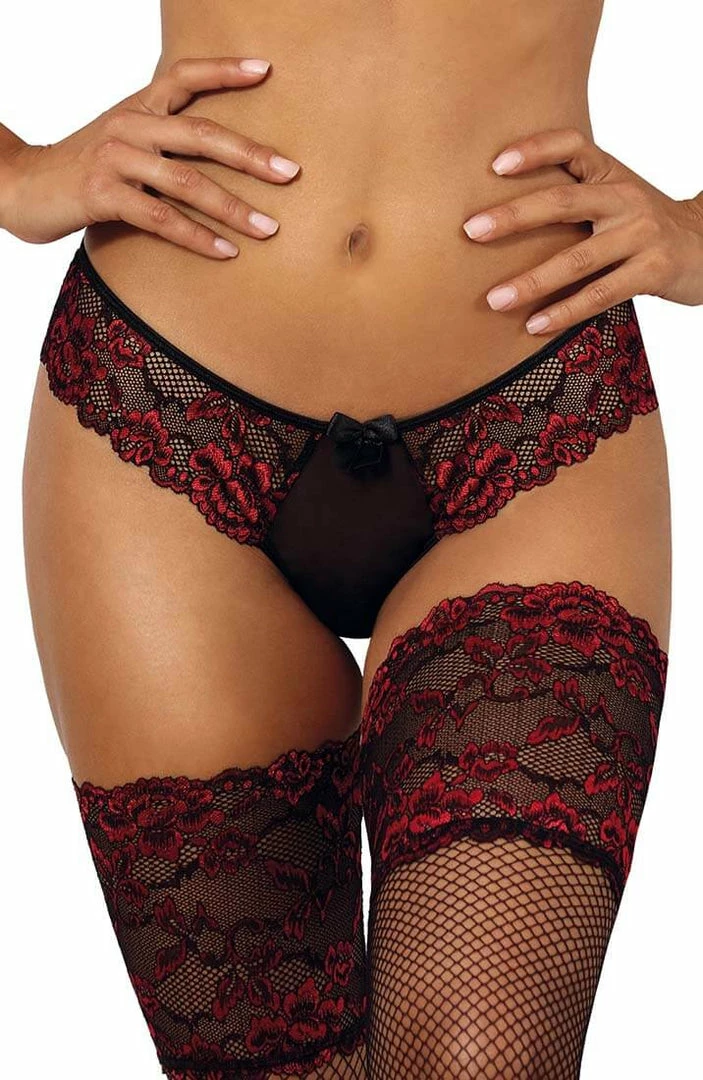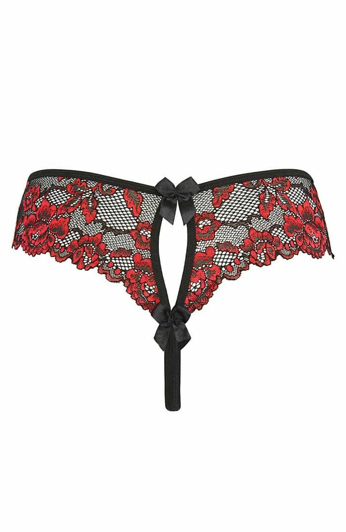 Your lover will not know how to react with you in this extremely sexy black crotchless thong with beautiful red embroidered lace, feminine black satin bow details and an eye-catching keyhole back.