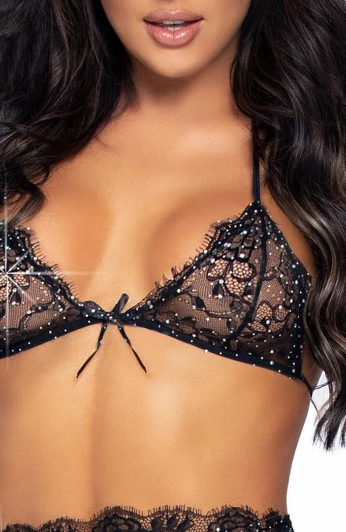 Black eyelash lace lingerie set with rhinestones