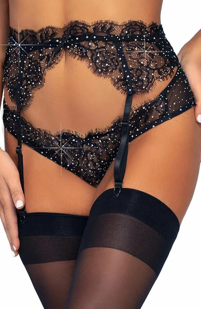 Sexy and feminine black lace lingerie set with the most divine shimmering rhinestones. The set features a halterneck bralette, matching garter belt in ‘scalloped’ lace and a the most ravishing delicate panties. All of which are slightly transparent.