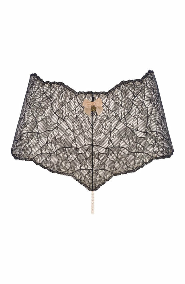 This hipster panty is made from an exclusive Italian black lace with gold lurex highlights and has the iconic white stimulating Manacor pearl string.