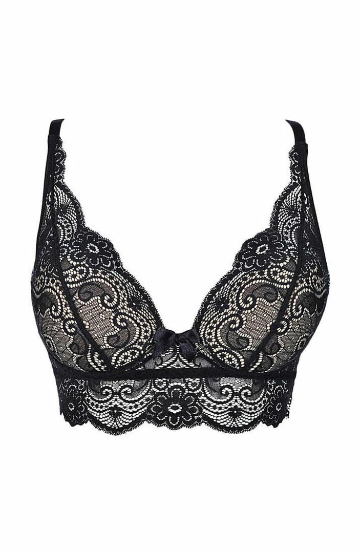 Beautiful black lace bustier bra with underwired and moulded cups. The bra has cross-over bra straps and a double eye-hook closure ensuring that the bra provides a firm hold and an elegant back.