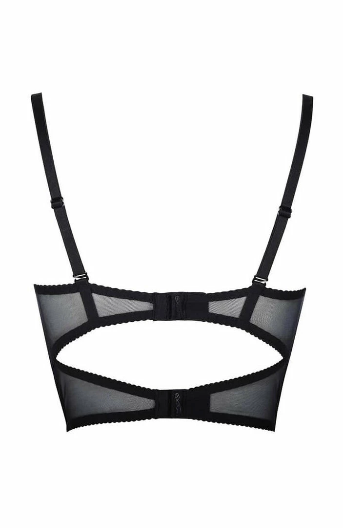 Sexy black bustier lace bra with double eye-hook closure at the back and detachable straps. The bra has a beautiful transparent longline with a black pattern that gives it a unique look.