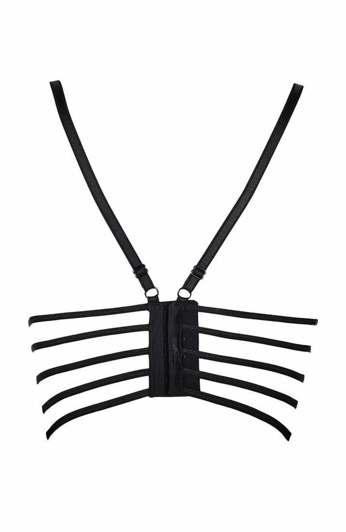 Feel yourself in this beautiful black lace bustier bra with a thin transparent underlay, and underwired cups. The back has a sexy cage-strap design consisting of 5 straps, that ensures a perfect fit and a pleasant hold.