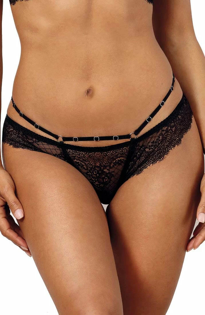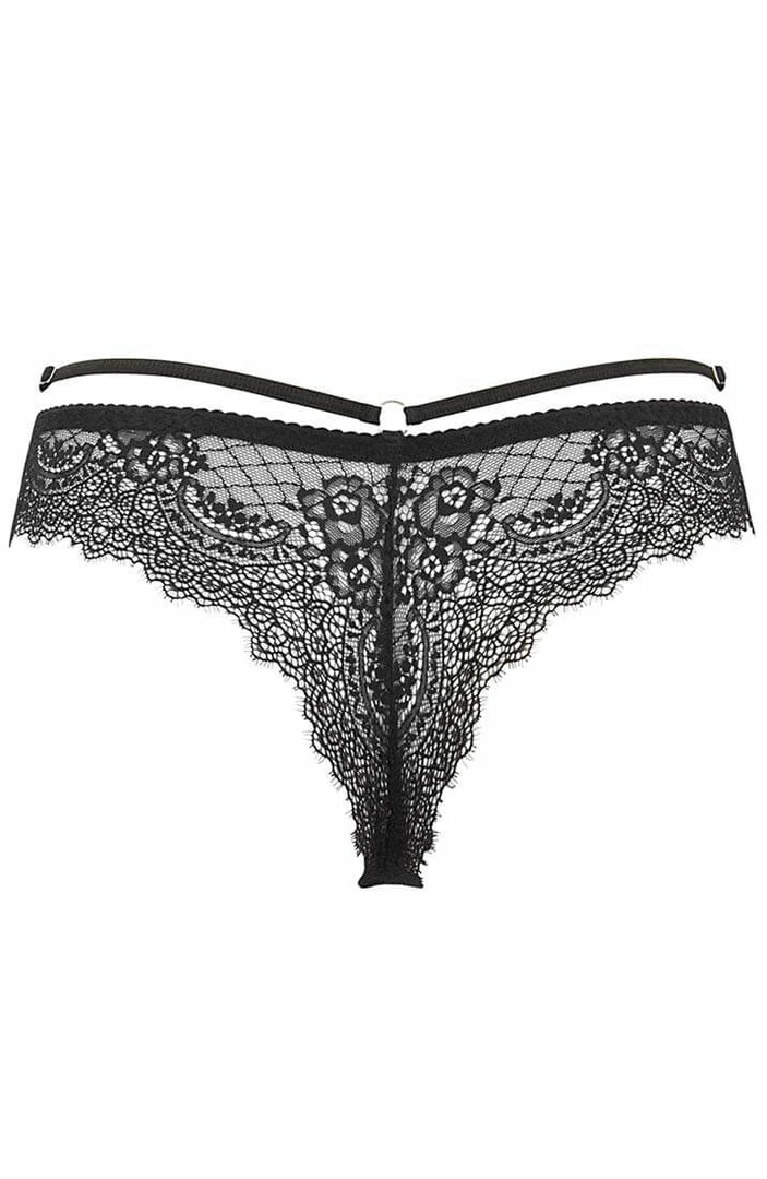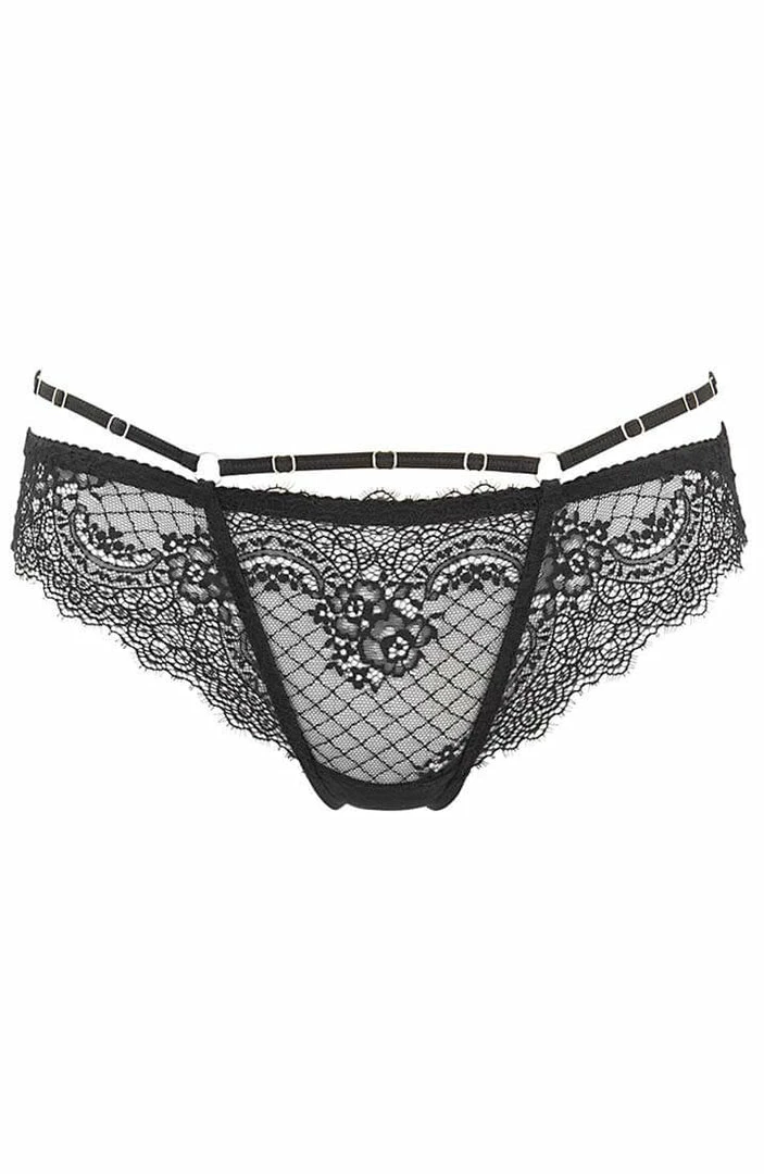 Feel fabulous in this flirty sheer black lace thong featuring a seductive cage-strap design with silver slides.