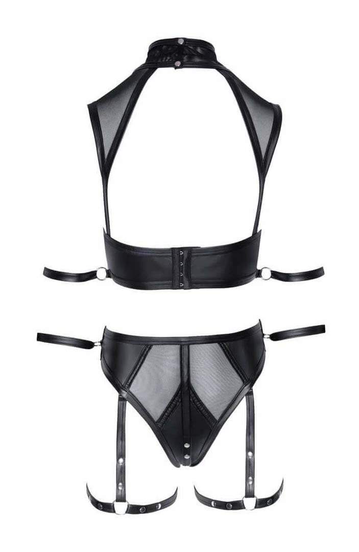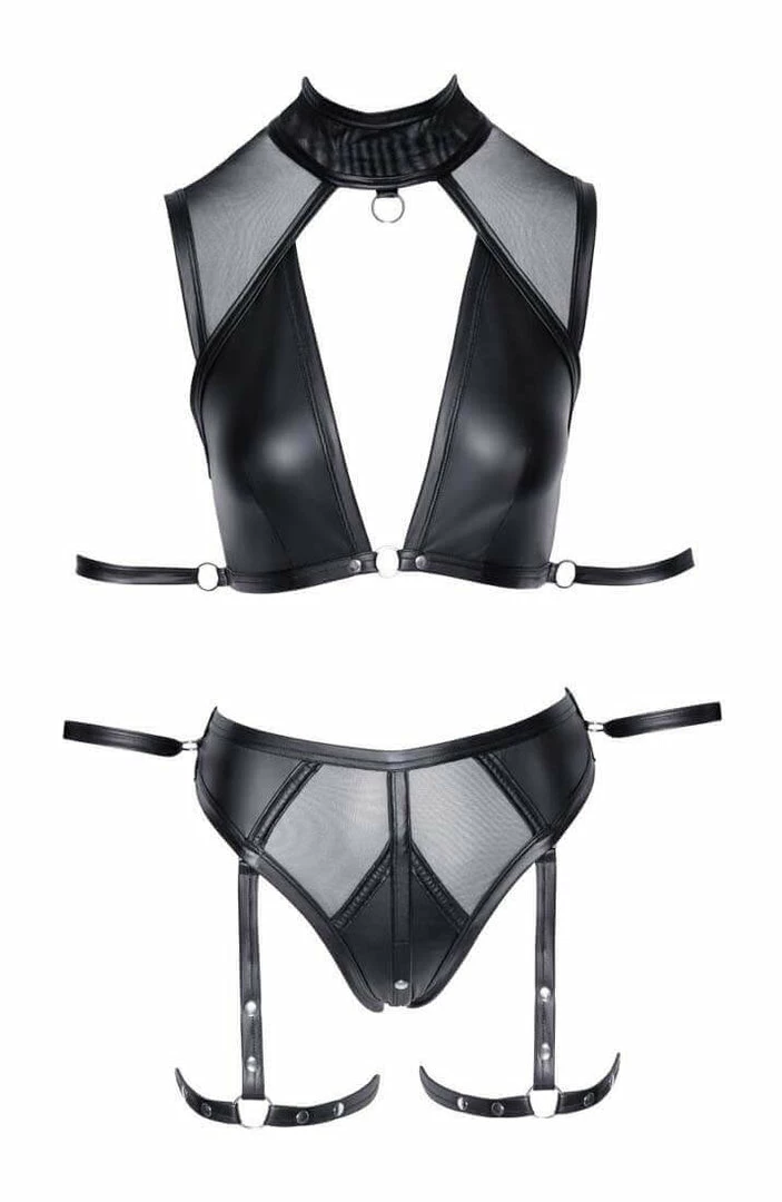 Let out your inner sensuality in this erotic lingerie set featuring a wet look bra top with sheer mesh shoulder, choker design, O-ring details with attached restraints, matching panty with press-studs crotch, detachable thigh straps and O-ring details with attached restraints.