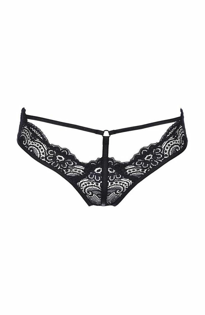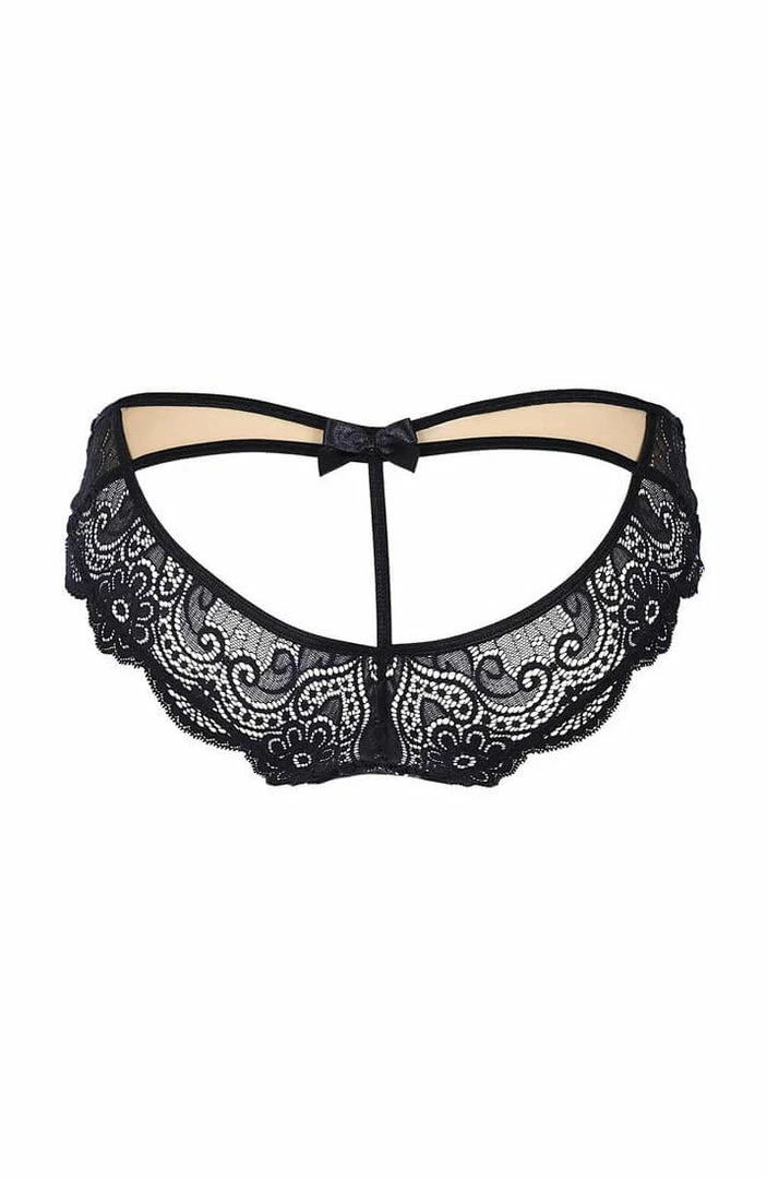 Sexy black lace brief panty with cage-straps and ‘peek a boo’ cut-out at the front as well as the back.