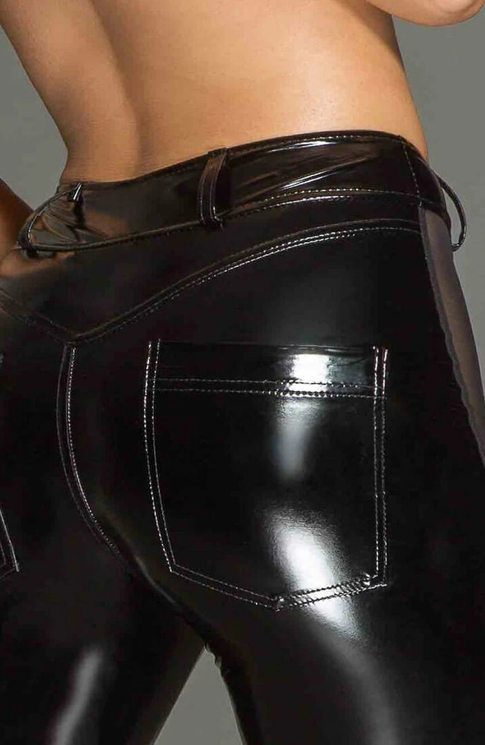 Incredibly hot glossy black PVC leggings with transparent mesh panels running down along the sides, making your legs seem long and slender.