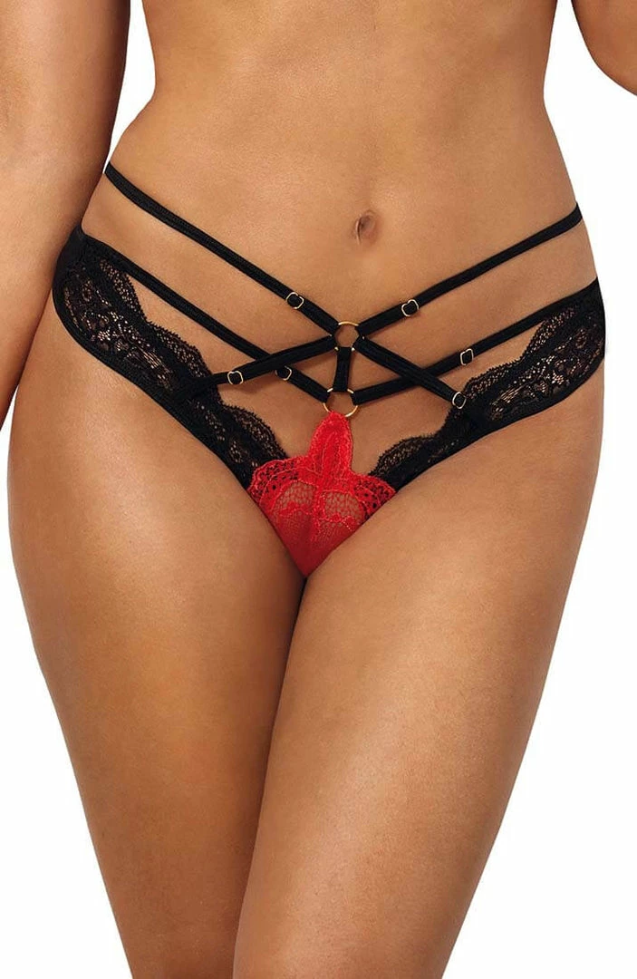 Tease to please in this erotic black and red contrast lace thong featuring a cage-strap mid waistband with gold slides for a perfect fit.
