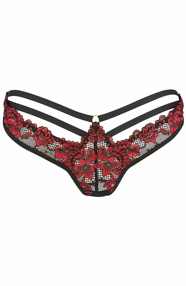 Show your babe just how sexy you can be in this seductive thong featuring a stunning red embroidery lace and cage-strap front.