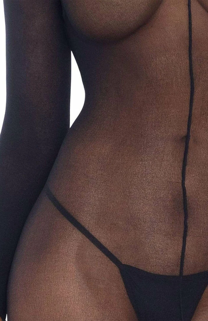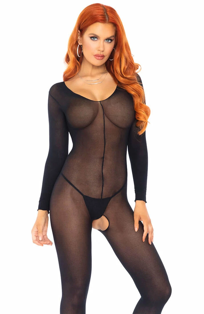 Daring and seductive crotchless bodystocking in sheer black nylon with long sleeves.