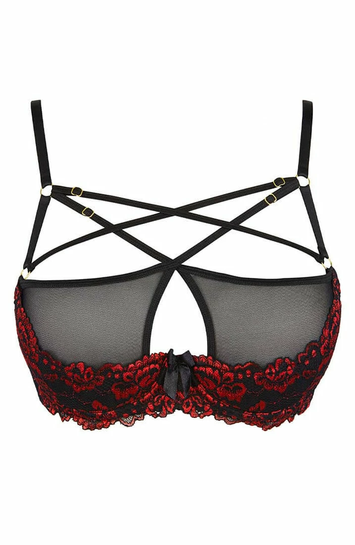 Treat your honey to a sexy surprise in this seductive shelf bra featuring shelf cups with a stunning red and black embroidery lace, sheer black mesh bust overlay and an erotic black cage-strap neckline with gold slides for a perfect fit.
