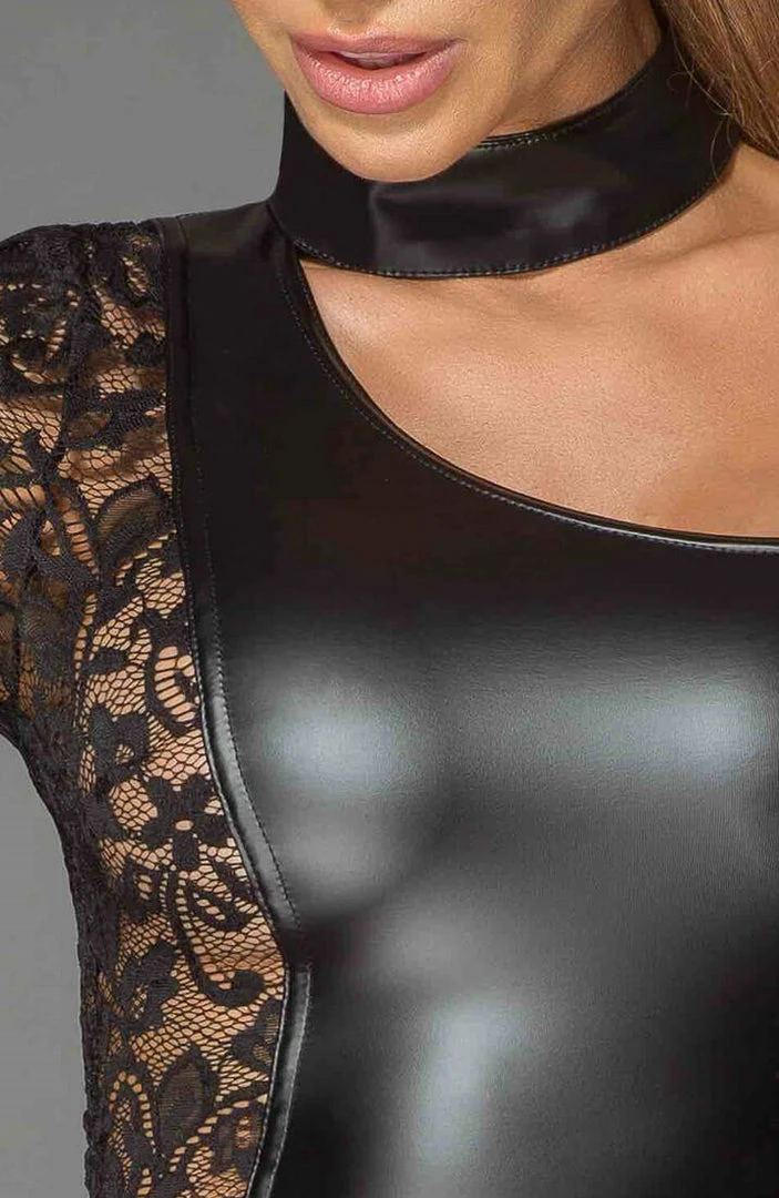 The dress is handmande from comfortable, thin and delicate wet look material, which is incredibly elastic, yet still with a very firm ‘hold’, ensuring that the dress has a beautiful snug fit. The black lace sleeve and panel at the side is sexy and extremely feminine.