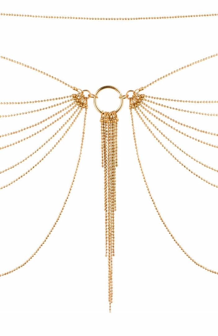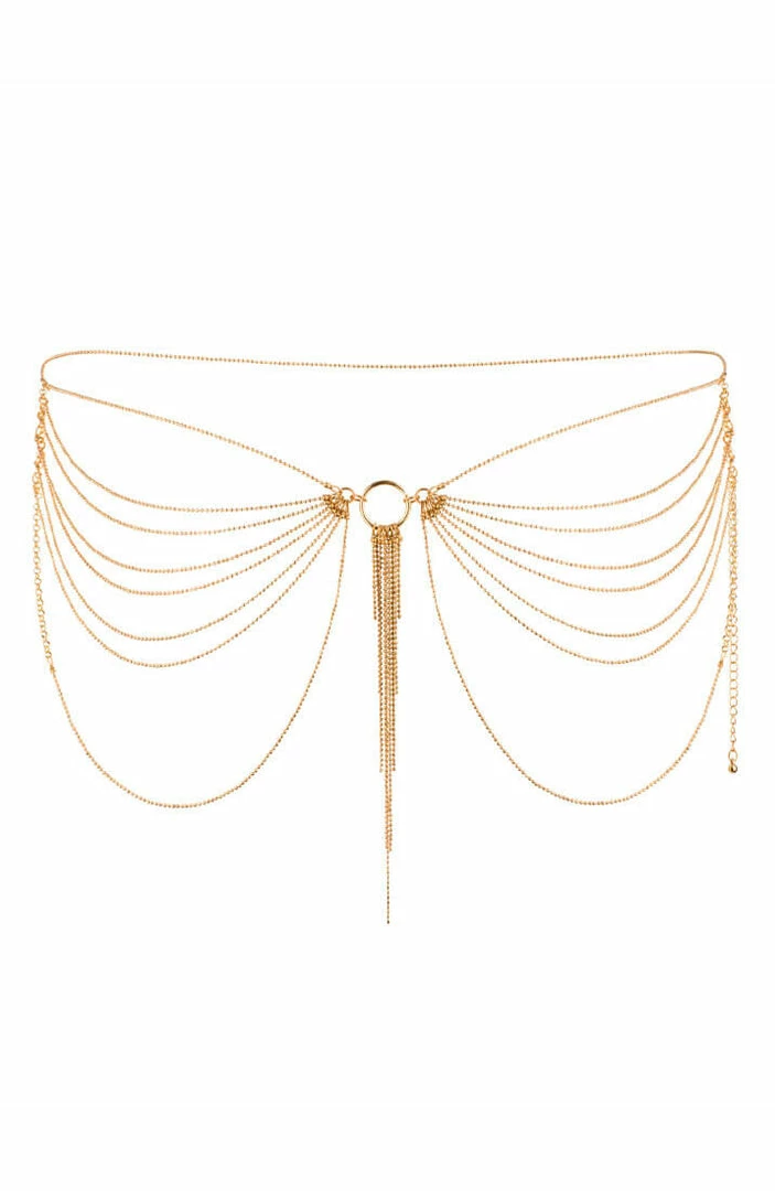 The erotic metallic gold waist chain highlights your waist for a unique and sexy look. The chain is adjustable for a perfect fit and is made of strong and durable metal.