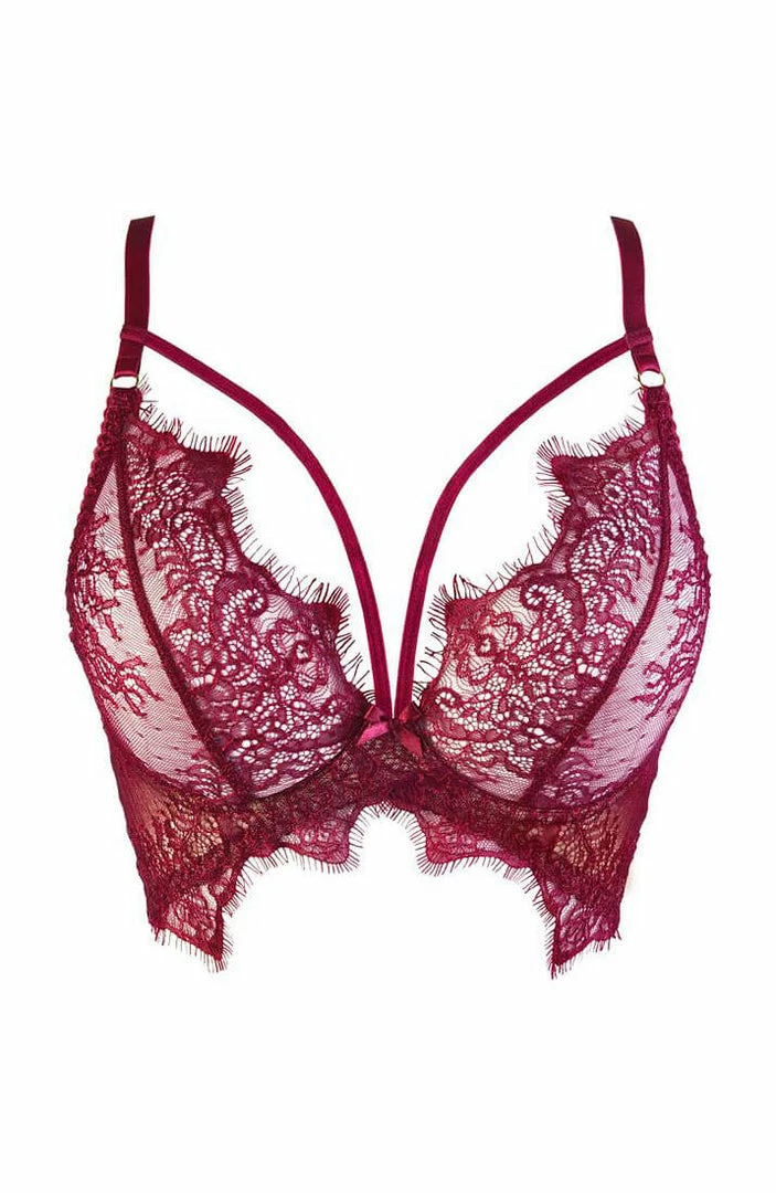 Intimates meets chic in this stunning burgundy bustier bra featuring sheer lace, delicate cage-straps at the front, double shoulder straps, a beautiful multi cage-strap back with double eye-hook closure.