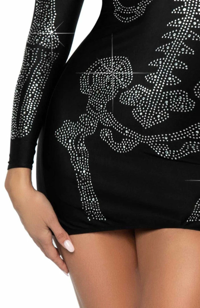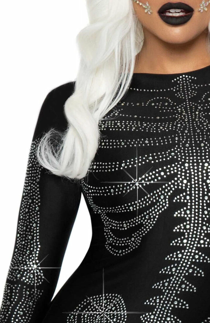 Sexy black skeleton costume with a bone pattern in shimmering rhinestones. The costume features a long-sleeve black spandex dress – the ultimate Halloween costume!
