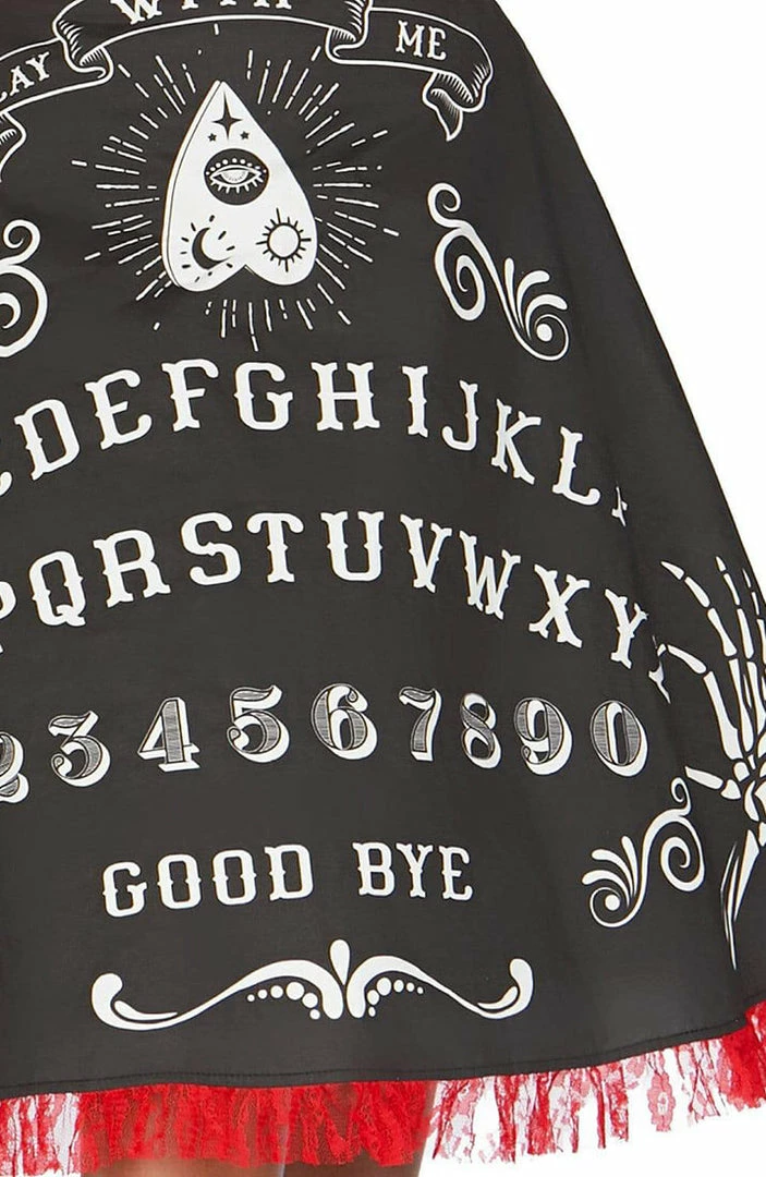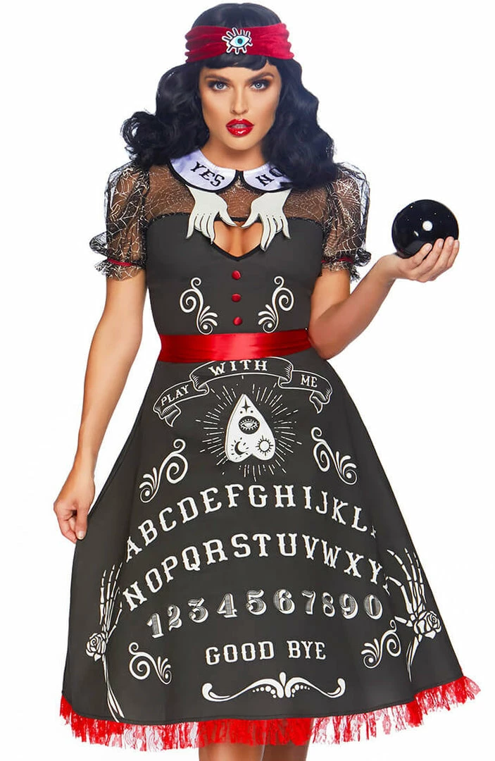 The waist is highlighted with an elegant red satin ribbon and to complete the true Fortune Teller look it comes with a velvet hair band – naturally with a ‘I see it all’ eye print.