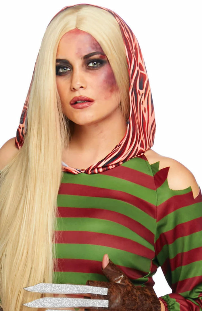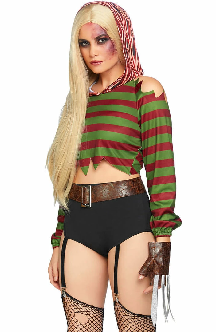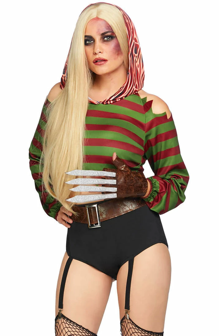 Dress up as Freddy’s killer girlfriend in this incredibly sexy costume featuring a green and red striped crop top with hoodie in ‘raw flesh’ print and cut-out shoulders, a pair of black high waist shorts with suspenders and belt – and last, but not least the iconic gloves with ‘knife blades’.