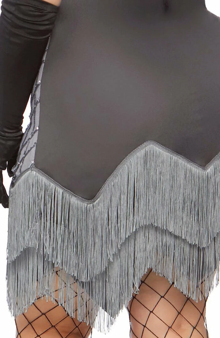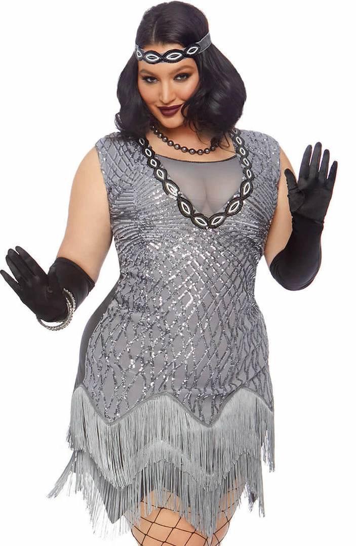 Dance the night away alone, with your girlfriends or with your chosen Mr. Gatsby in the most beautiful sparkling silver plus size flapper dress with sequins, fringes, and matching sequined headband. Gloves sold separately.