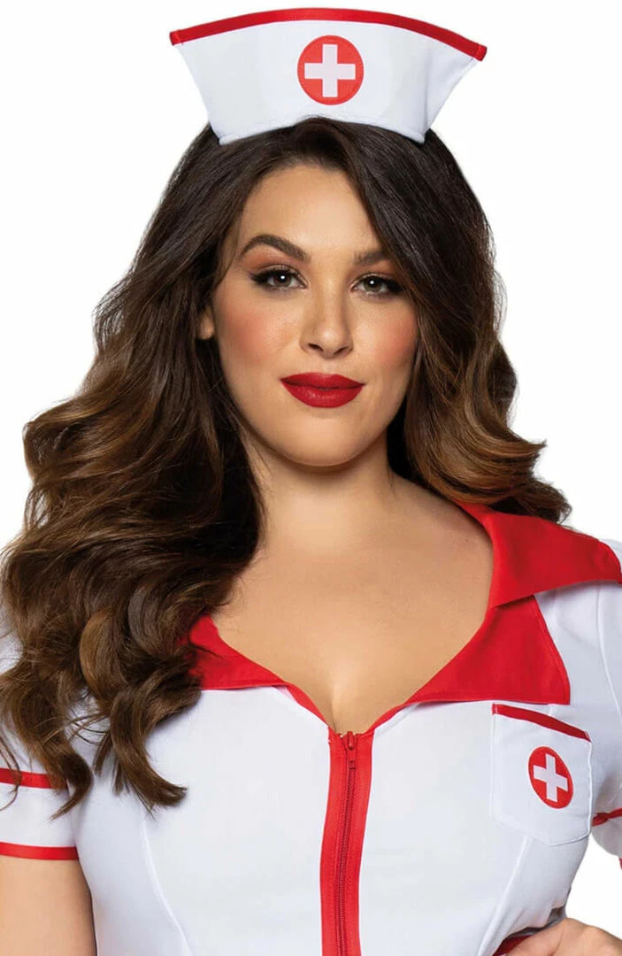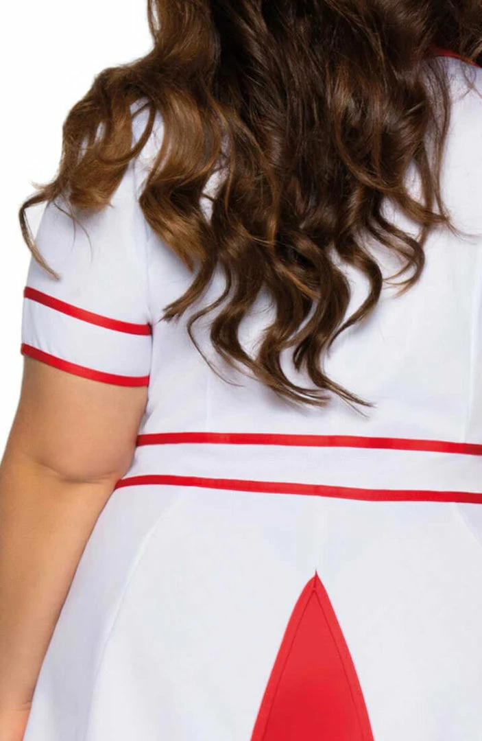 The plus size nurse costume includes a white dress with sleeves and a red front zip closure, red trim and panels. Adjust the cleavage to where you see fit.