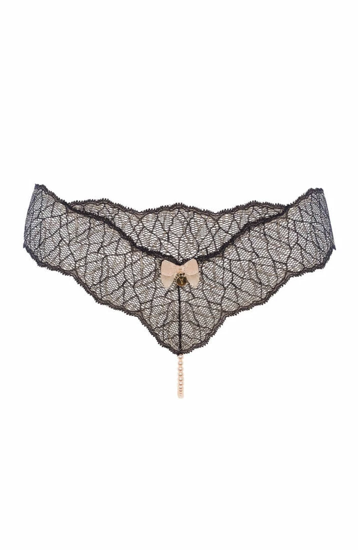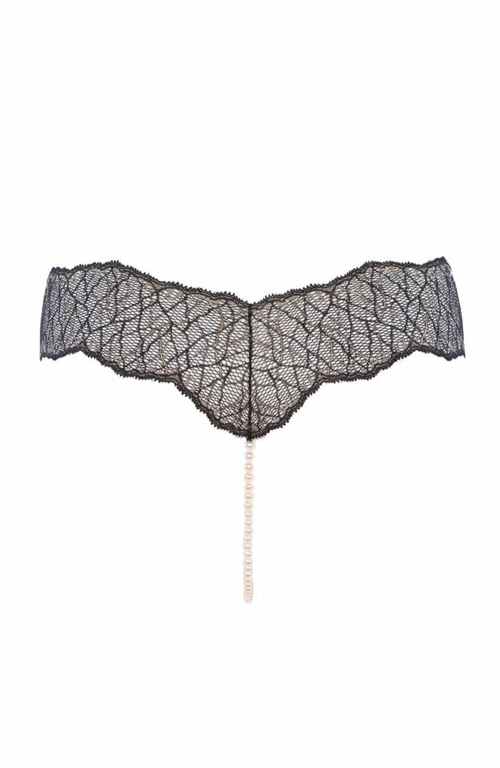 This thong is made from an exclusive Italian black lace with gold lurex highlights and comes with the iconic stimulating pearl string made from white Manacor pearls.