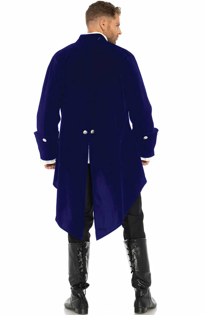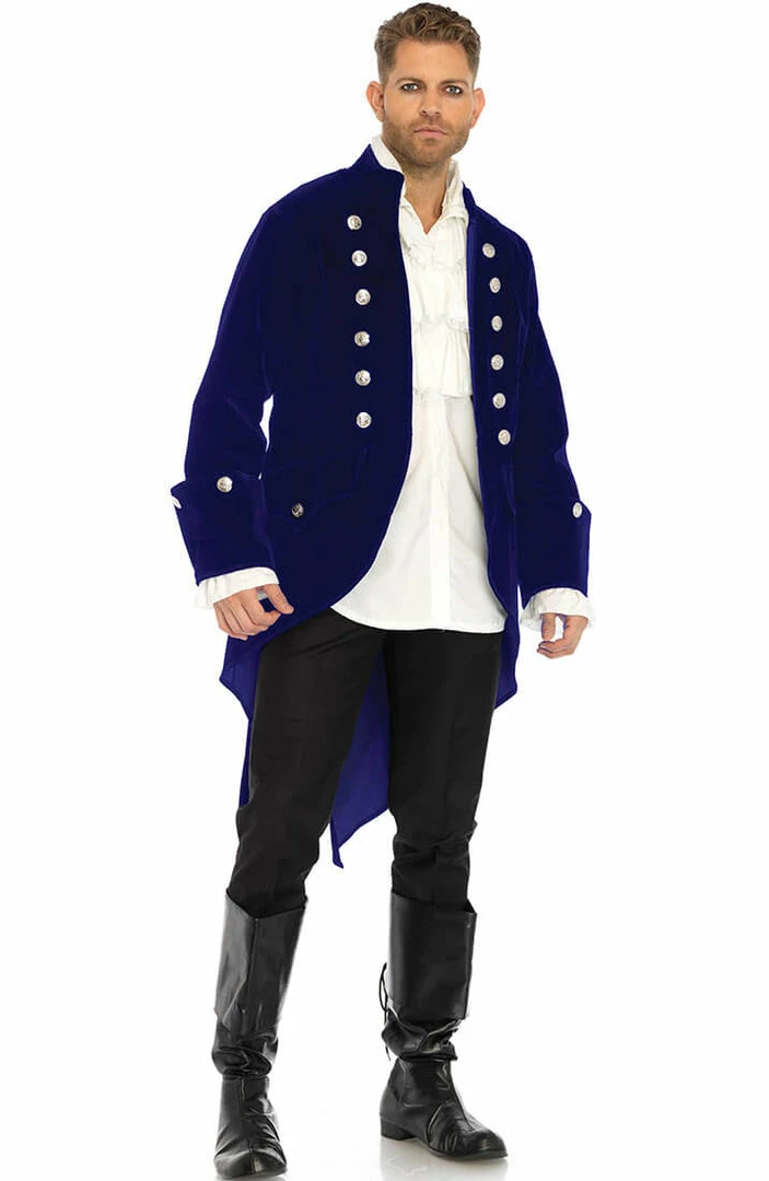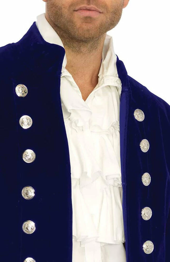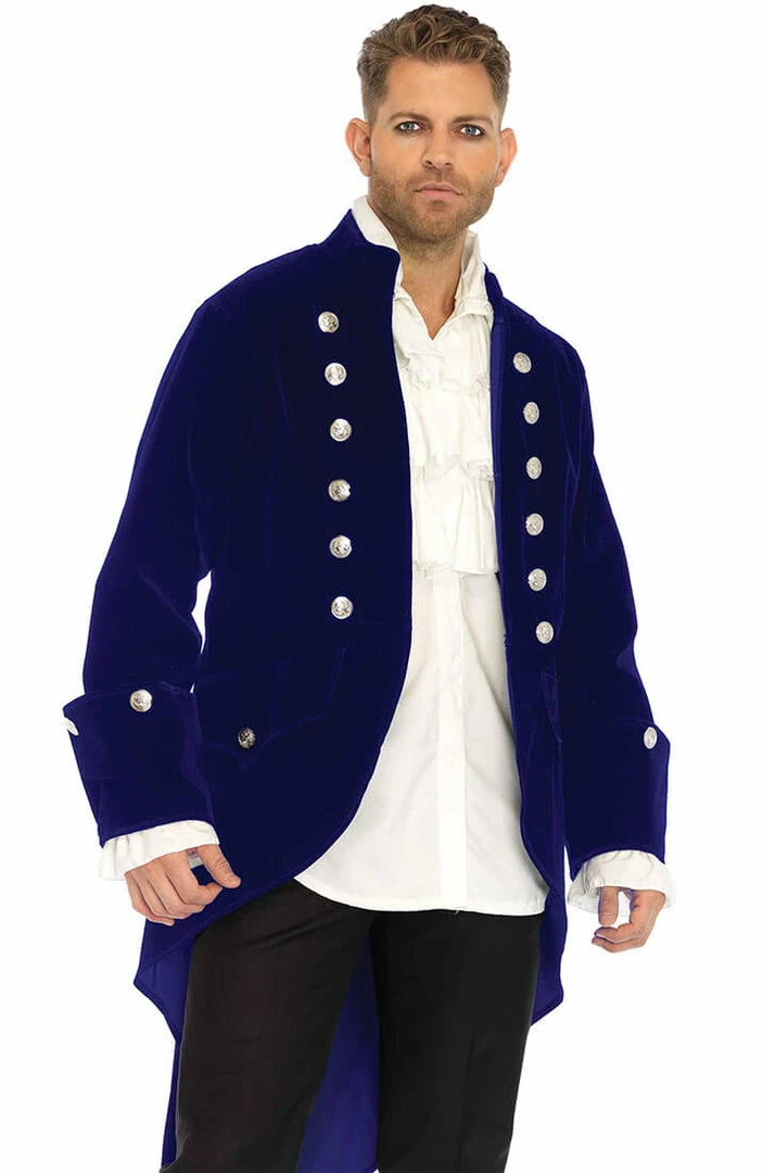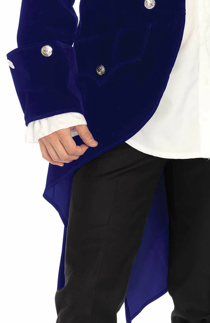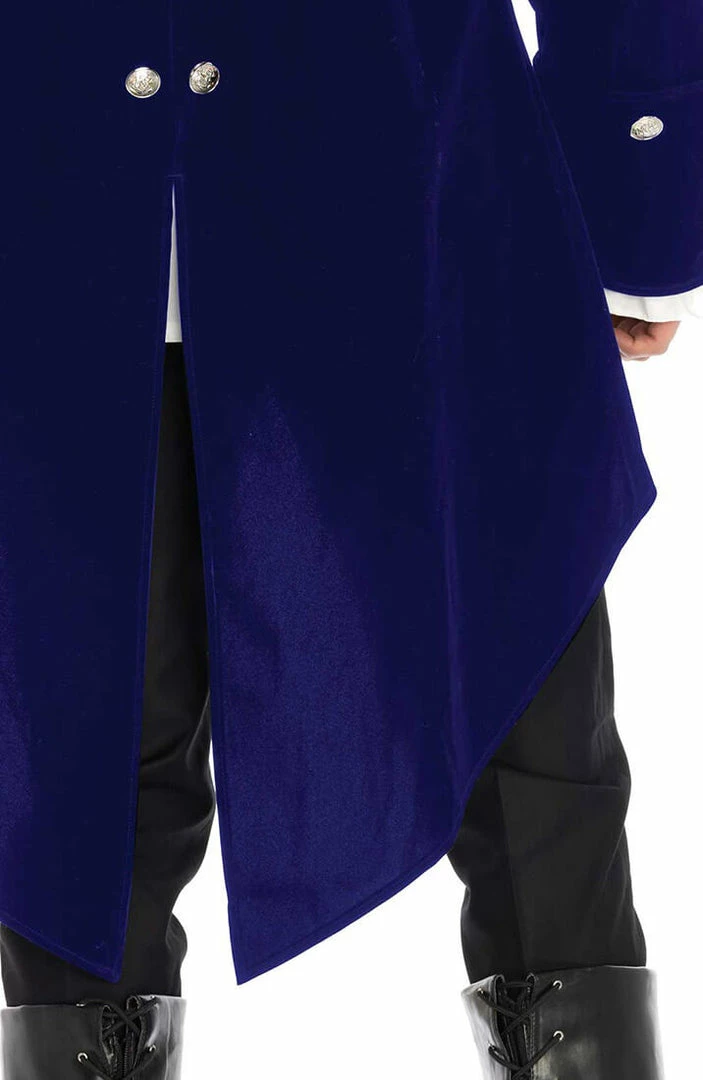 Extremely cool and complete long velvet coat in a handsome deep blue colour with silver buttons and wide cuffs.