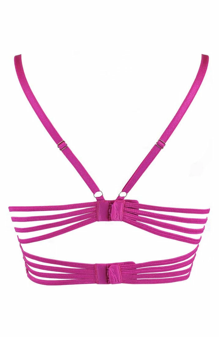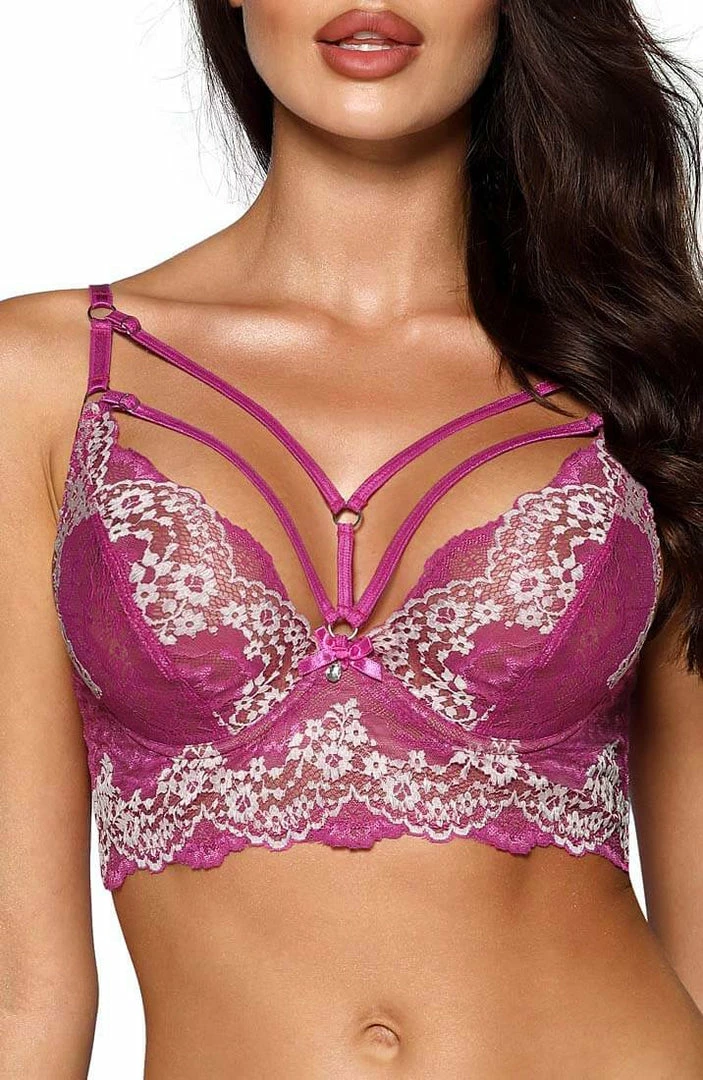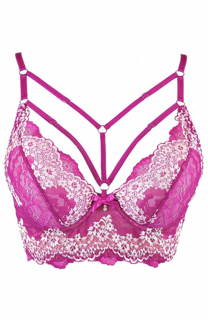 Have your honey longing for you in this beautiful limited edition fuchsia lace bustier bra featuring a white floral lace contrast, adjustable cage-strap, front jewel and a stunning double eye-hook back closure.