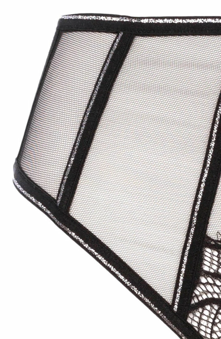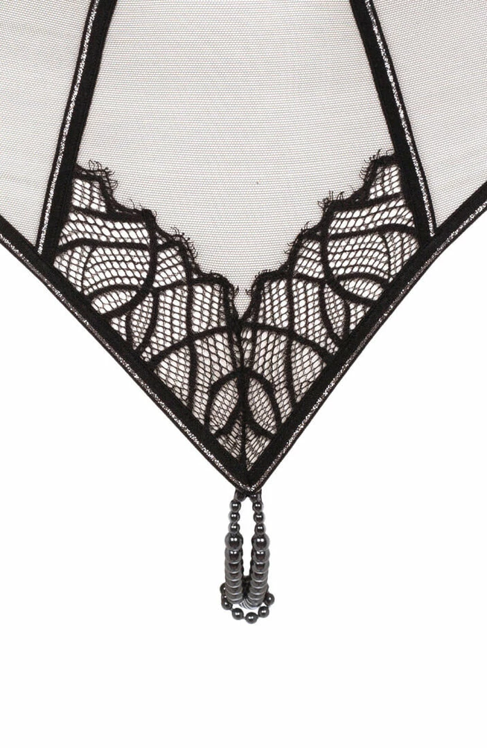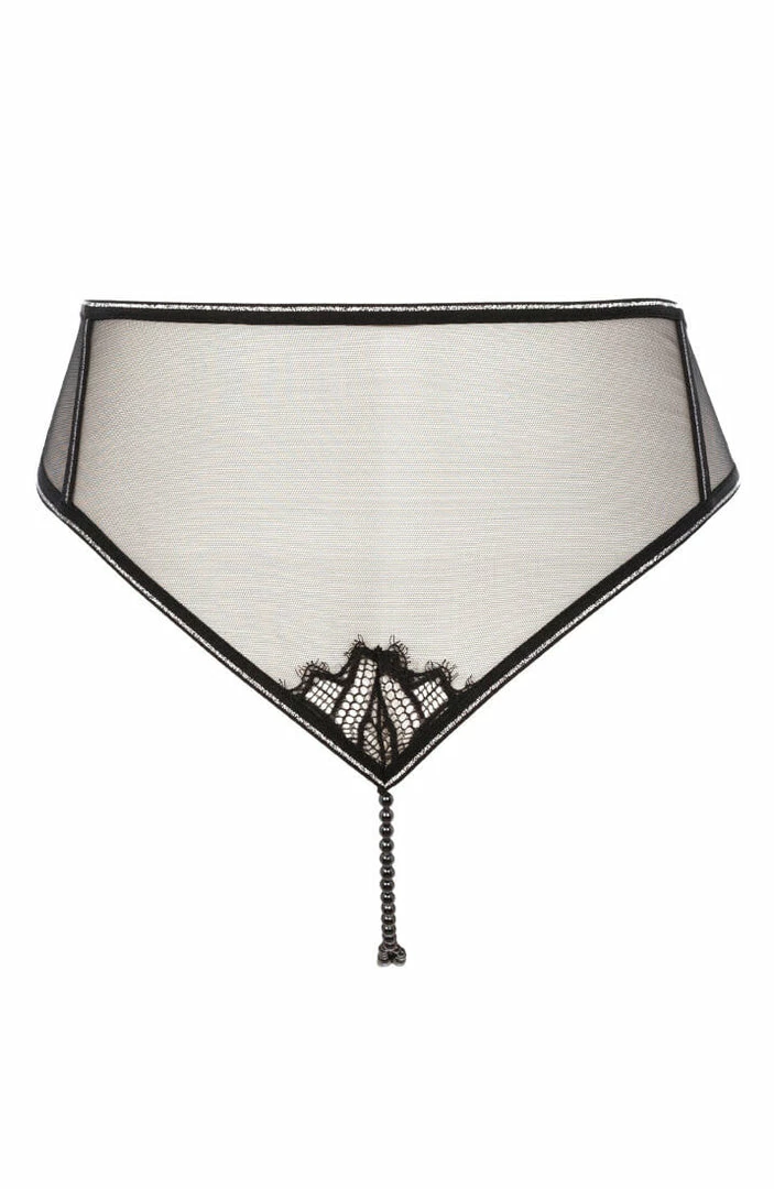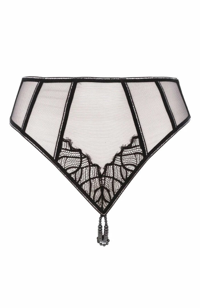 This high-waisted and high-cut panty slims the figure and visually lengthens the legs. The panty is made from a recycled Italian black lace with silver lurex highlights and comes with a stimulating black double pearl string.