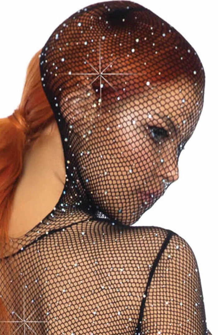 Black fishnet bodysuit with long sleeves and an erotic hood. The bodysuit is decorated with sparkling rhinestones ALL OVER!