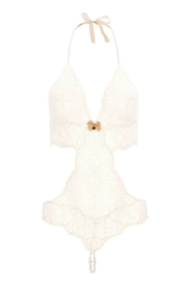 The bodysuit is made from an exclusive Italian ivory lace with gold lurex highlights and comes with the iconic stimulating double pearl string made from the unique Manacor pearls.