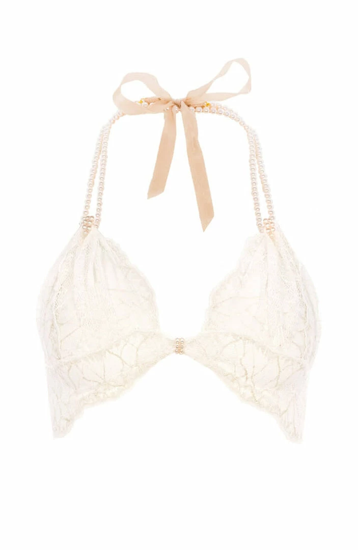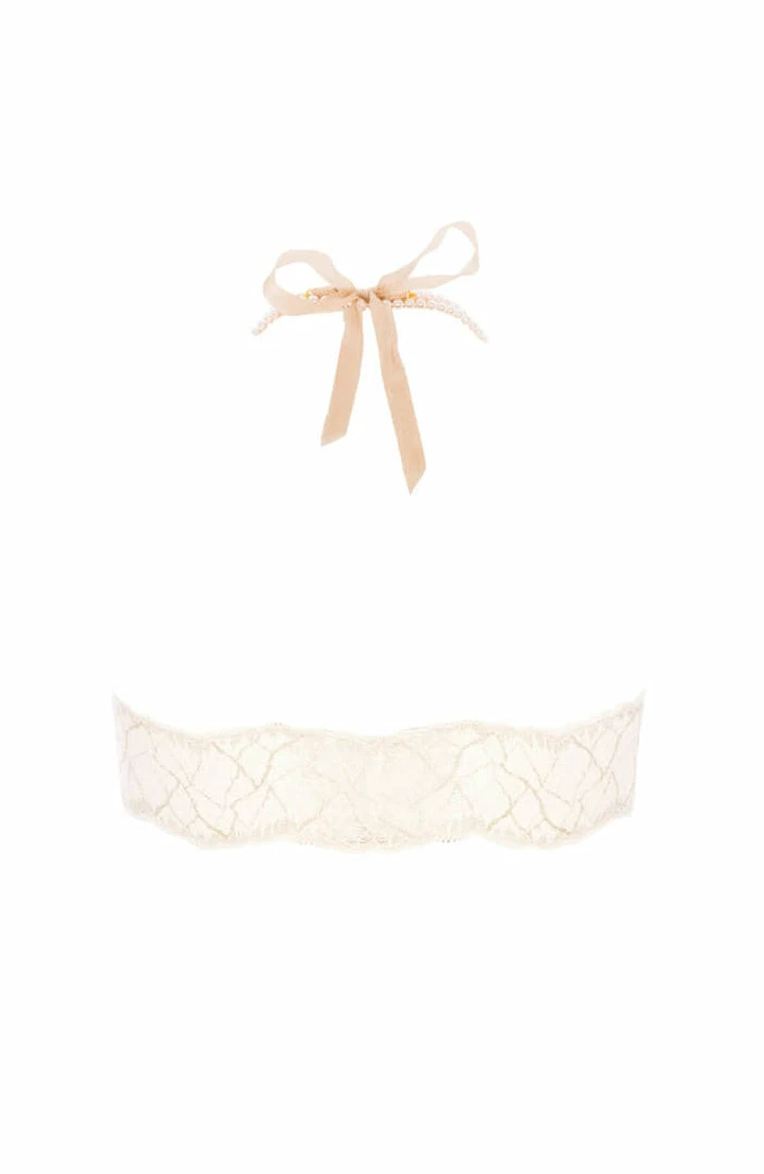 The bra is made from an exclusive Italian ivory lace with gold lurex highlights and has a stunning white double pearl strand made from Manacor pearls.