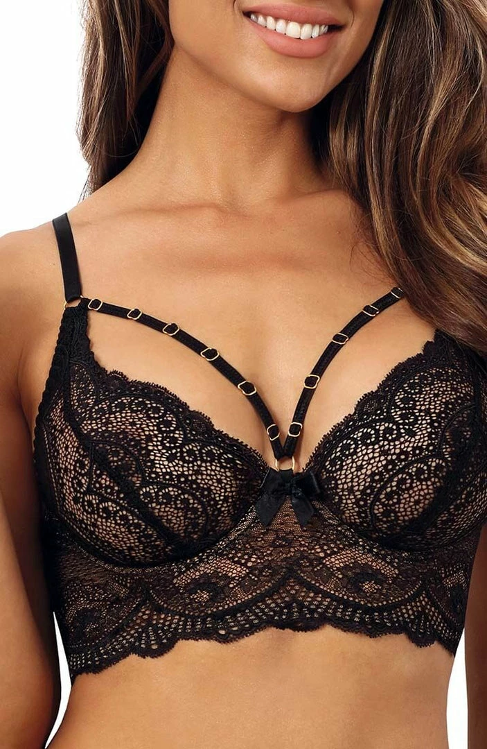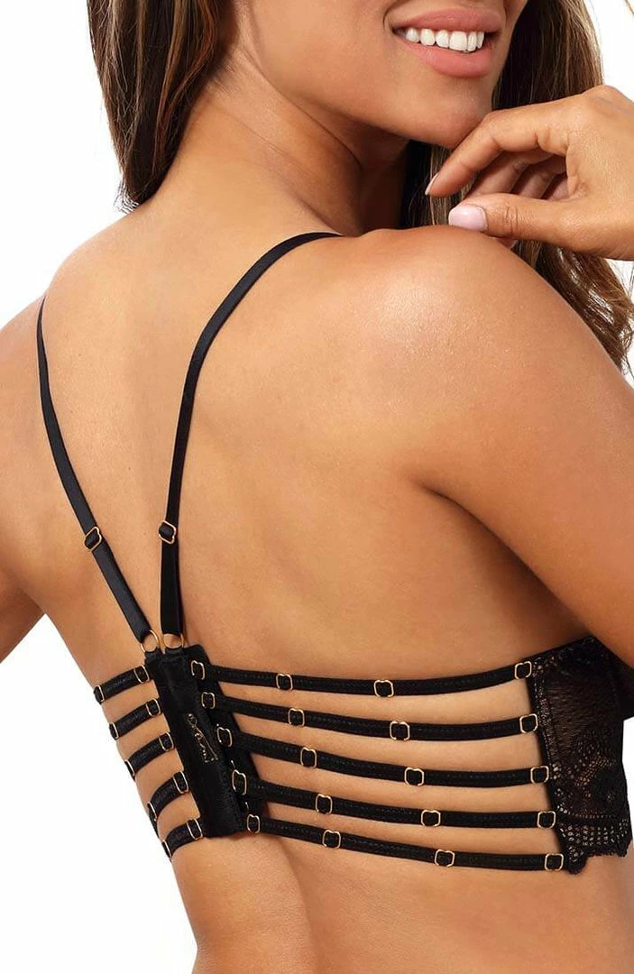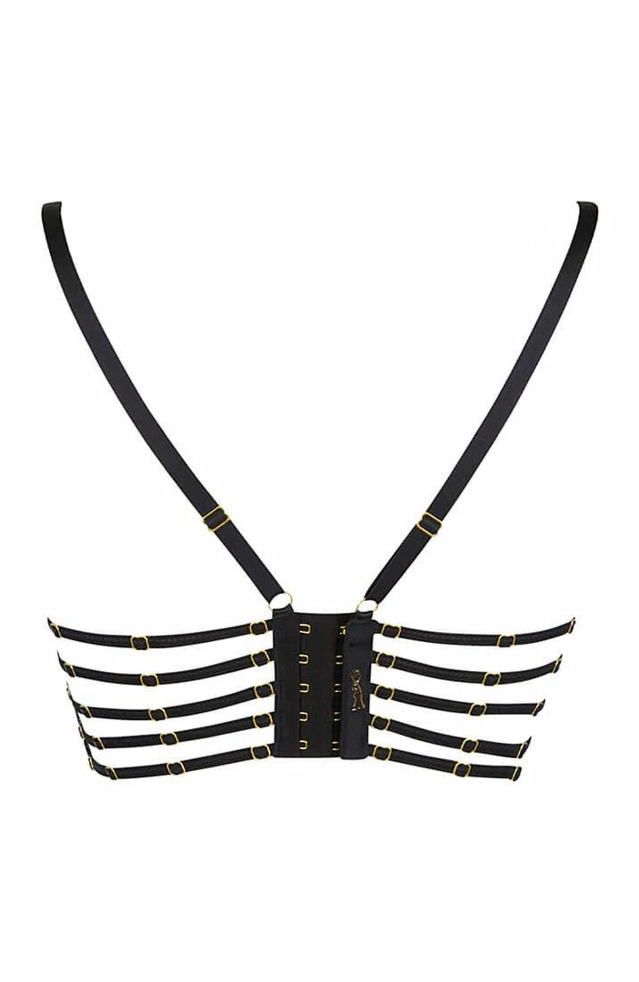 Fulfill the sensual bedtime fantasies with this sexy black bustier bra featuring sheer black lace cups, a black lace underbust with a nude underlay, erotic cage-strap details with gold slides for a perfect fit and a multi cage-strap back with eye-hook closure.