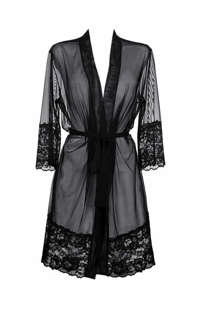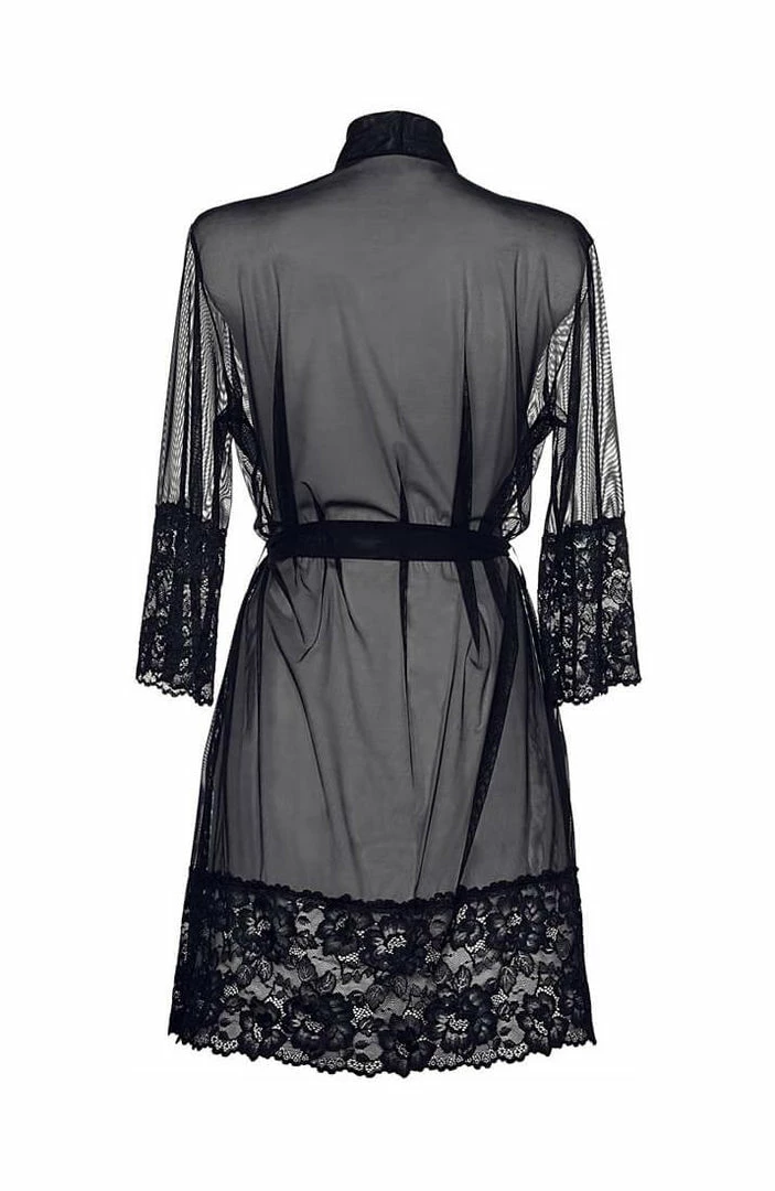 Make love in the moonlight in this exclusive black robe featuring beautiful lace trim, a sheer mesh bodice and a balck waist belt.