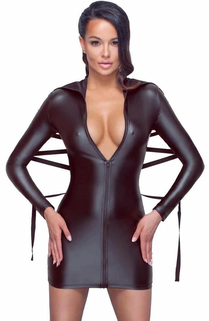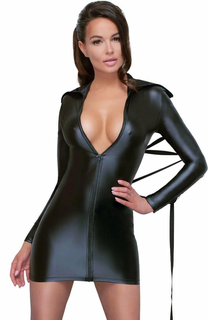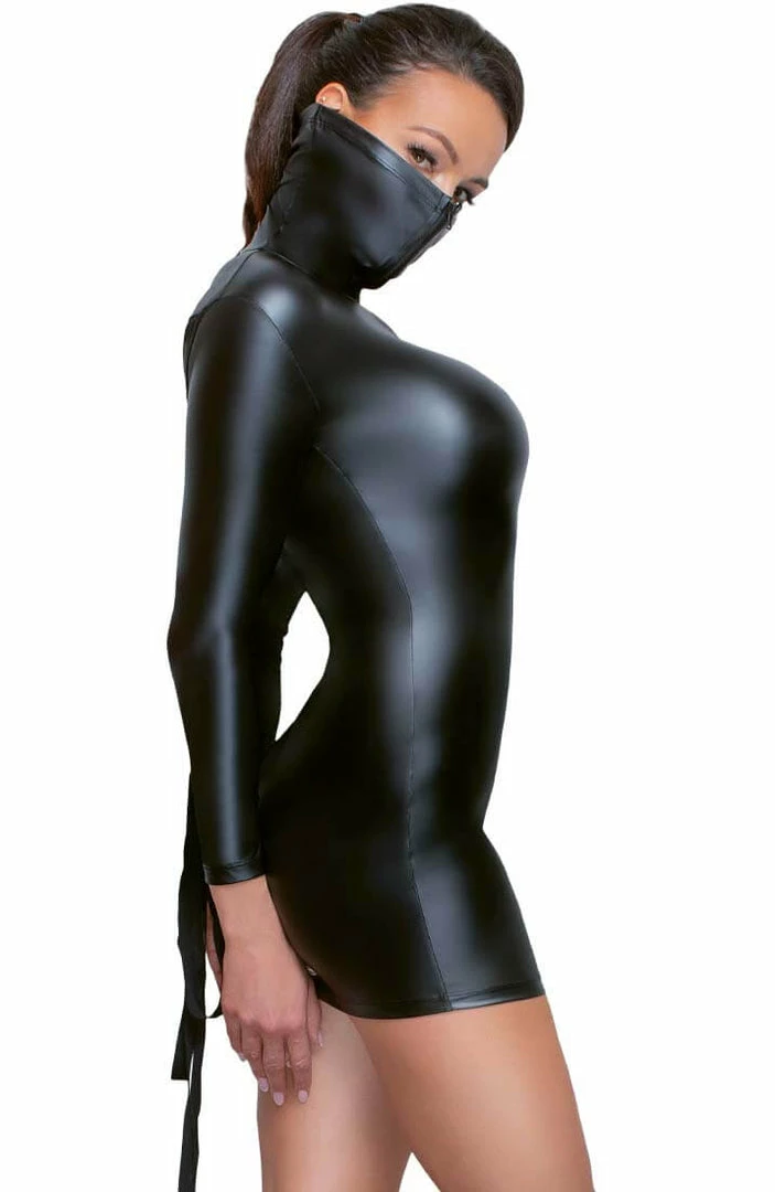Enhance your intimacy with this ultra sexy tight-fitting stretchy bondage dress featuring a long sleeve design, an extravagant high neck over-the-nose collar, a black all-the-way front zip, bondage tie-back ribbon stripe attached to 5 metal O-rings on it on each sleeve.