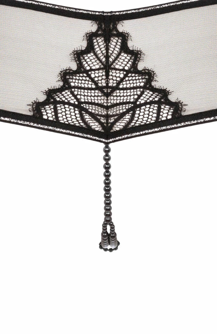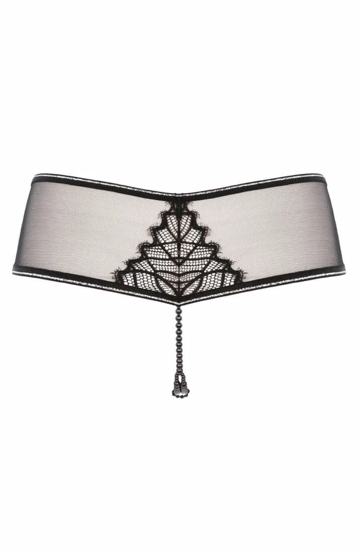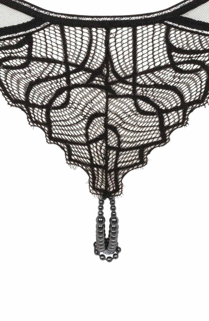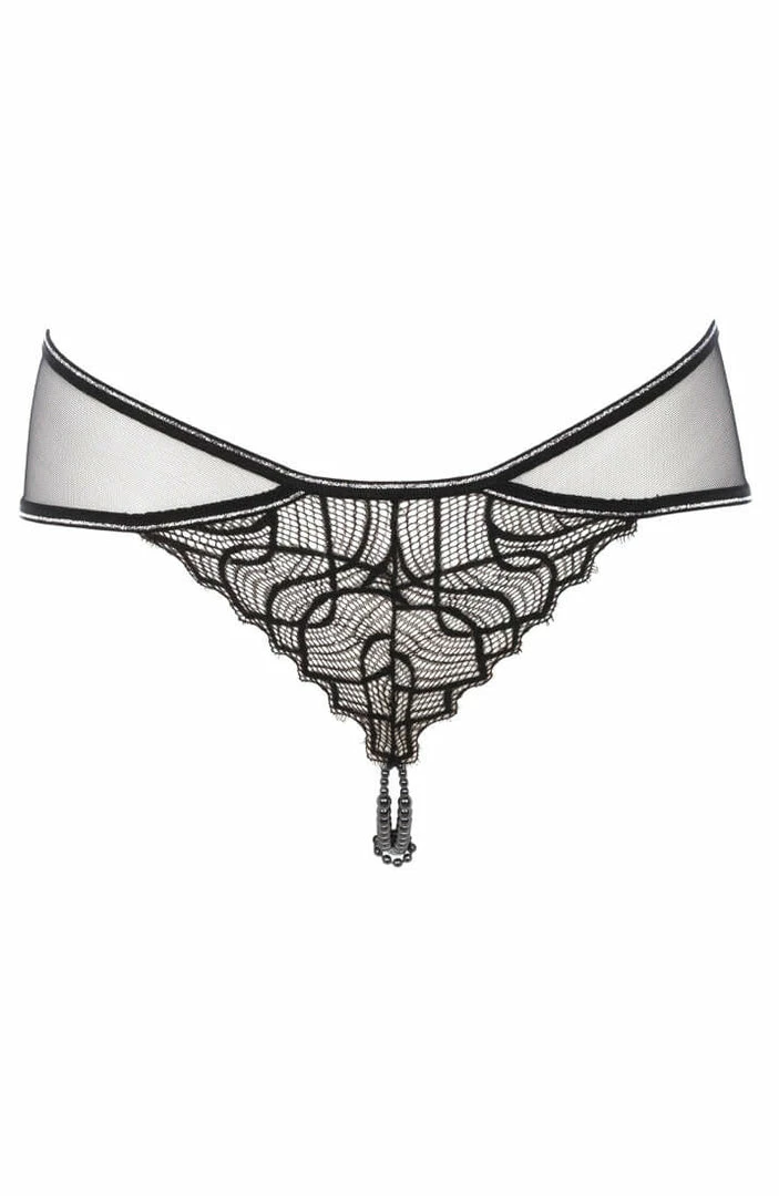 This low-waisted brief panty is made from a recycled Italian black lace with silver lurex highlights and comes with a stimulating black double pearl string.