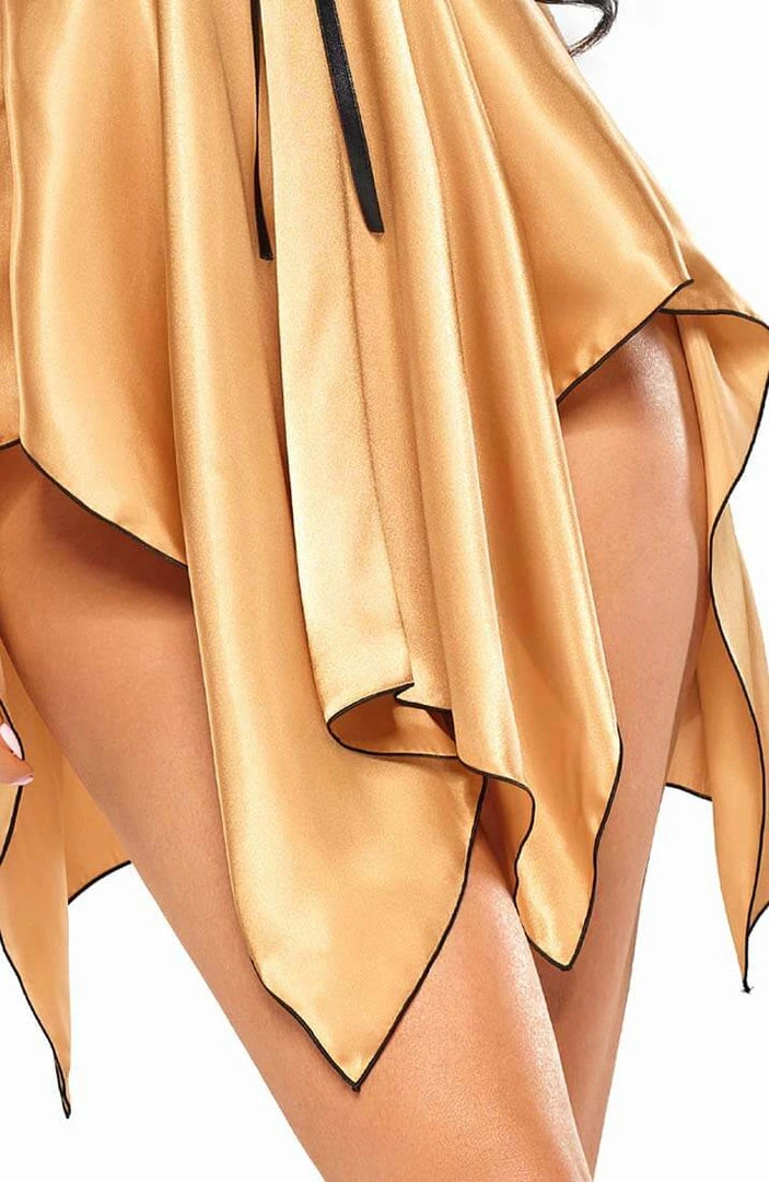 Let your lover sweep you off your feet in this stunning gold satin nightie featuring an asymmetrical and flowy design, beautiful black lace overlay, a cute satin bow accent and a matching string panty.