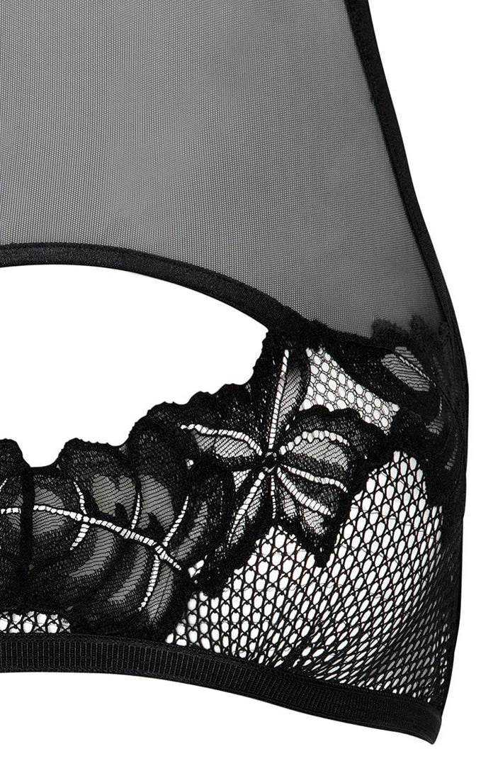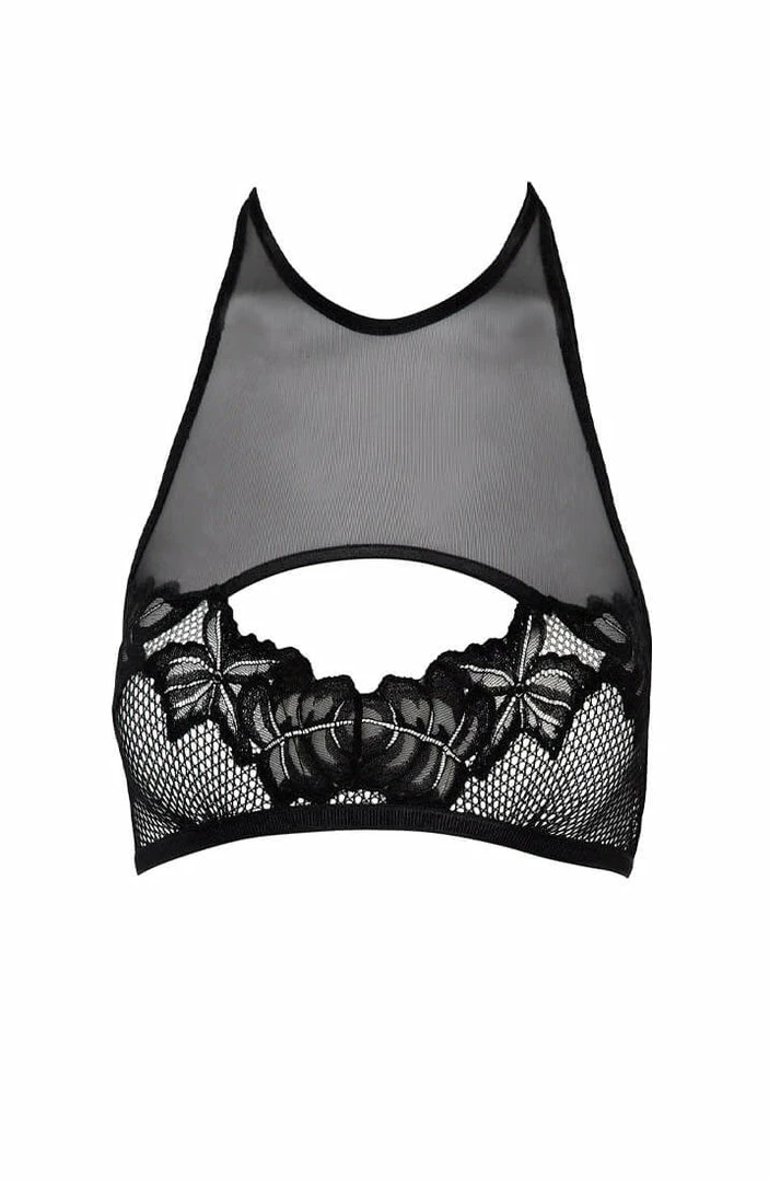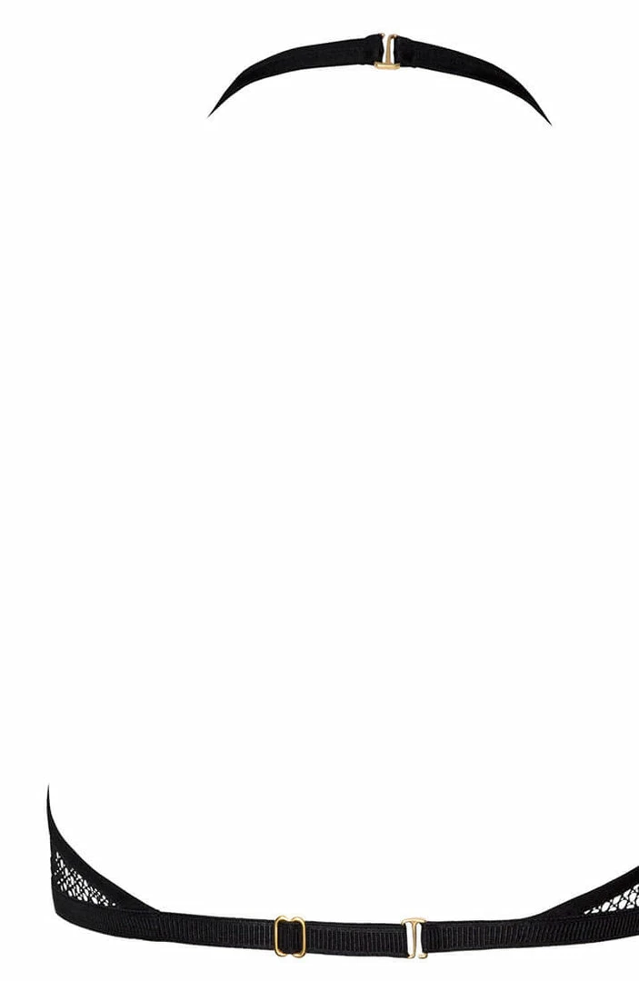 Exclusive black halter neck bra top in sheer mesh, delicate leaf lace, small fence net and golden appliqués giving you a sophisticated and elegant look.