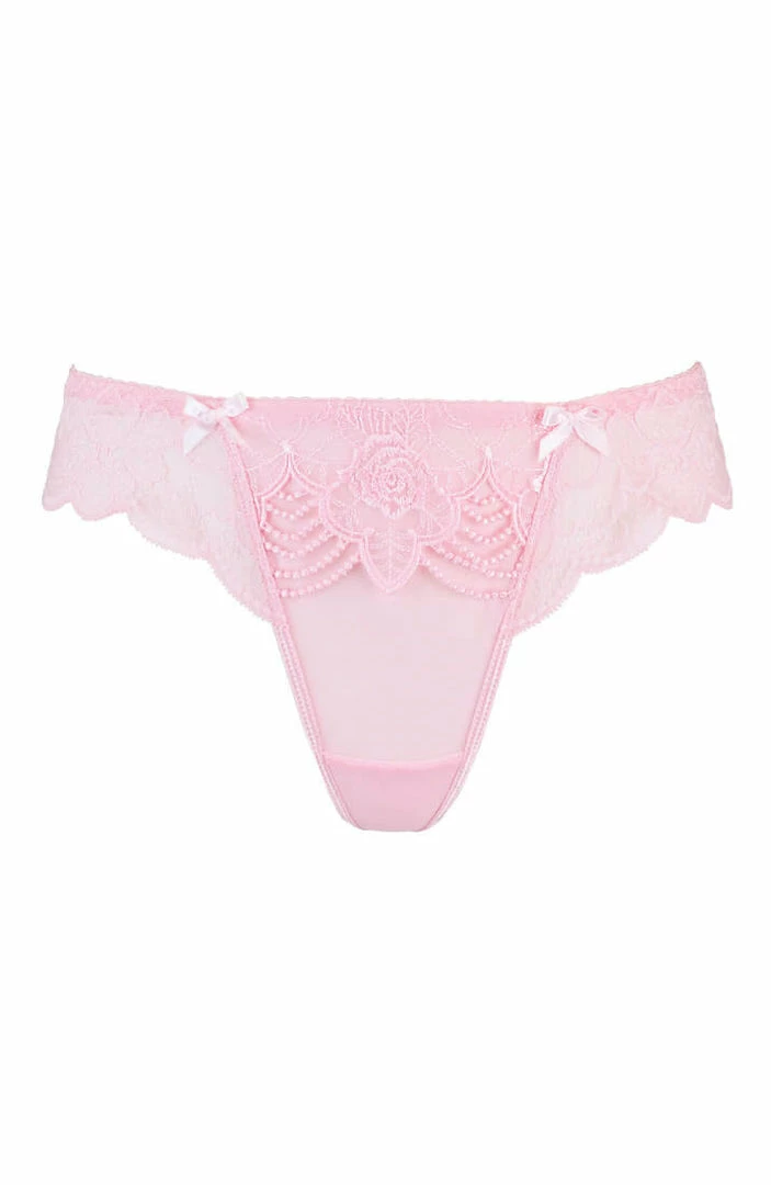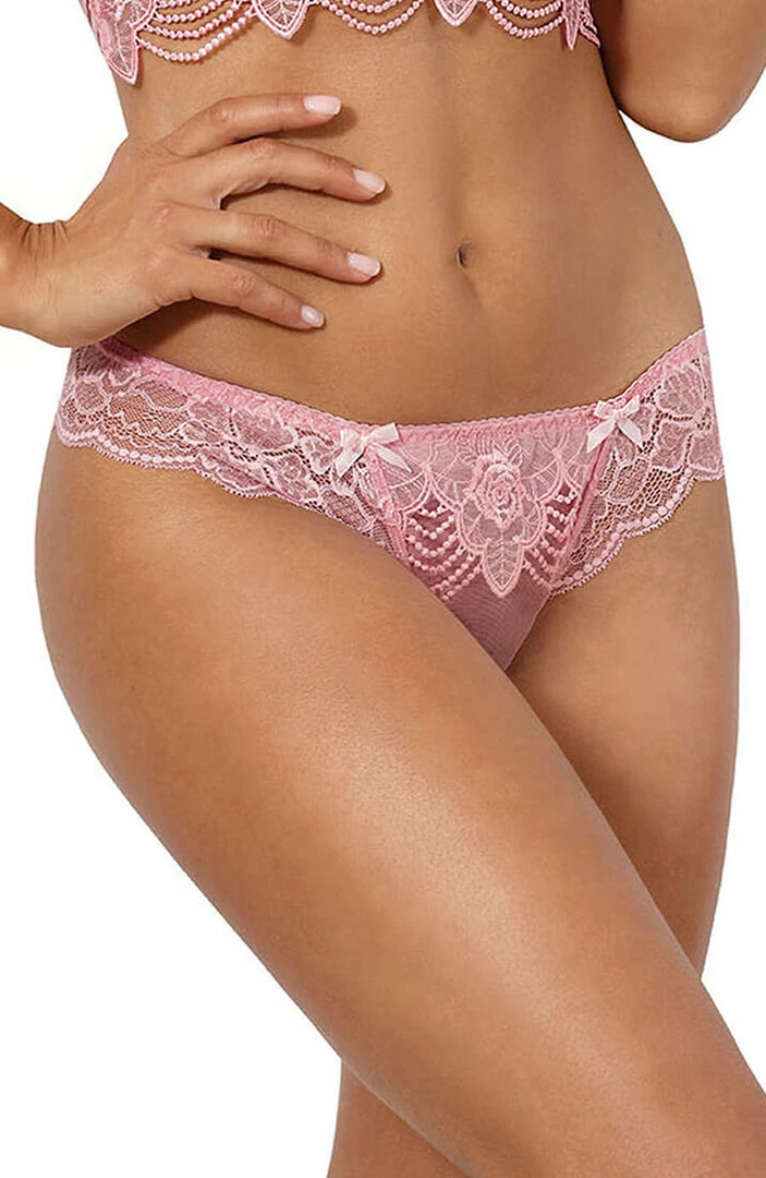 Beautiful pink string panty with a feminine lace and small satin bows at the front and back.