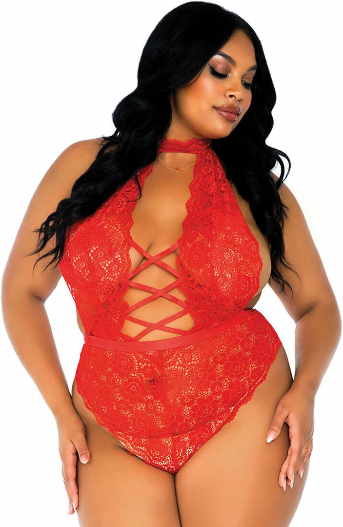 Sexy and sassy crotchless plus size red bodysuit in the most beautiful lace with a seductive deep cross-over neckline.