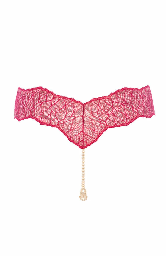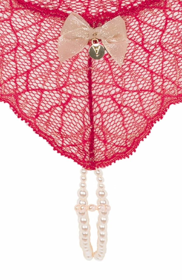 This thong is made from an exclusive Italian red lace with gold lurex highlights and comes with the iconic stimulating double pearl string made from the unique white Manacor pearls.