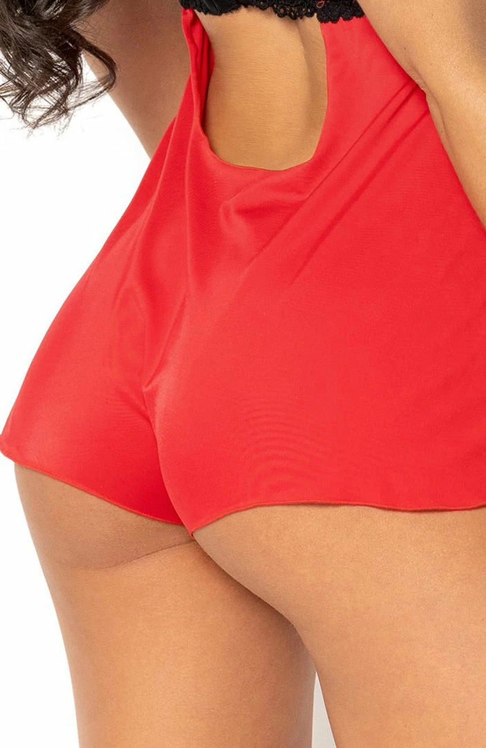 Incredibly soft and comfortable red romper with black lace and sassy cut-outs at the front.