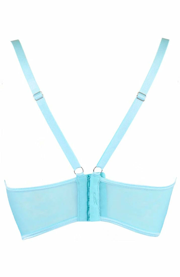 Dive right into a hot summer romance with this sexy turquoise bustier bra featuring sheer floral lace, a stunning longline with a glossy embroidery, a wide back with a 5 x eye-hook closure and a V-strap back making sure your shoulder straps stays in place and doesn’t slide down.