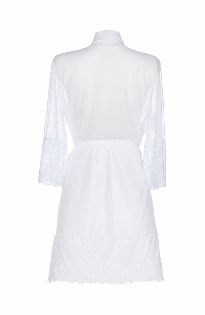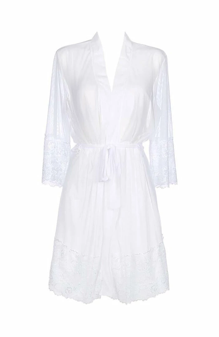 Play pillow tease with your man in this exclusive white robe featuring beautiful lace trim, a sheer mesh bodice and a white waist belt.