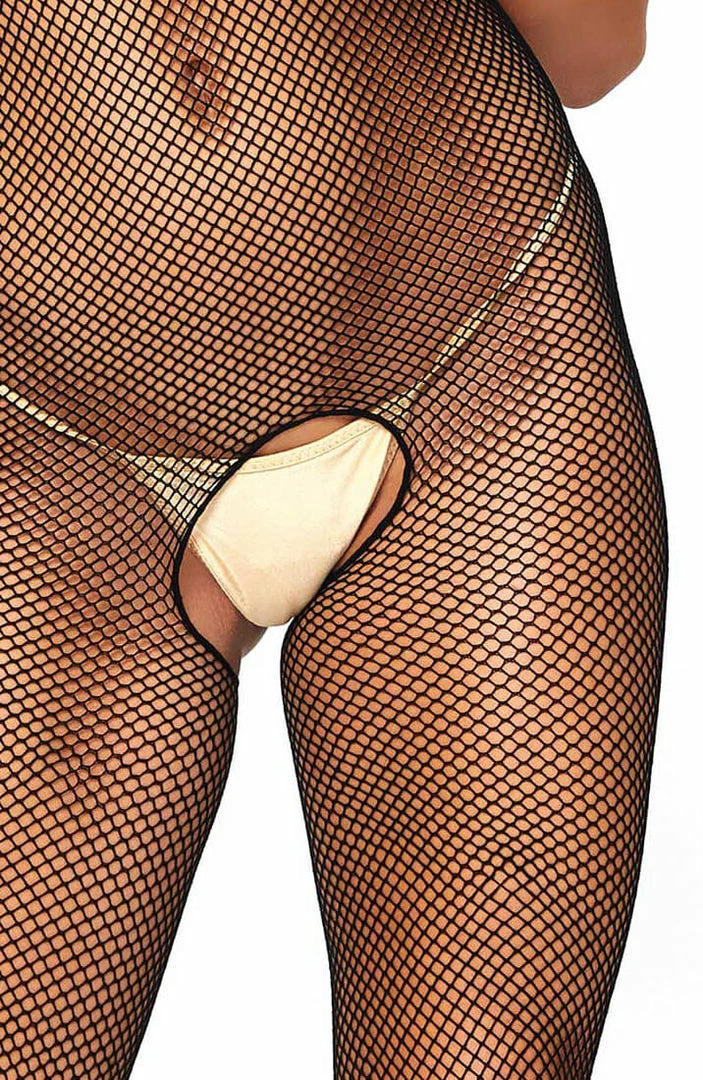 Ultra sexy black fishnet bodystocking in comfortable and elastic material with an erotic open-cup and crotchless design. The bodystocking has a seductive deep open back.