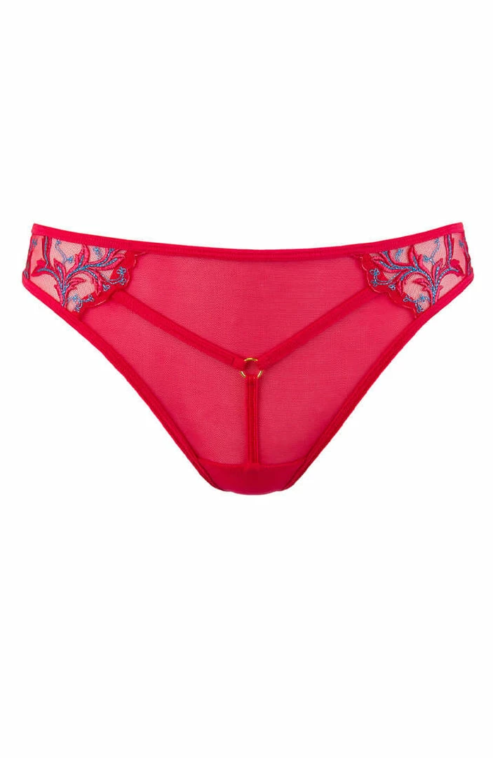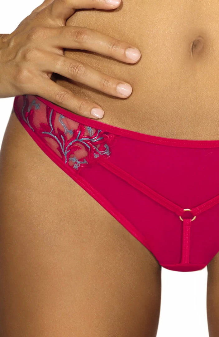 Match the sexy pink shelf bra with the feminine raspberry pink thong. The thong is decorated with a stunning turquoise embroidery and an intriguing cage-strap front detailed with a gold o-ring.