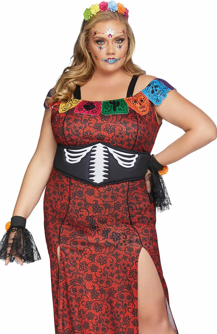This plus size Halloween costume features a long figure-hugging red dress with a black lace overlay, Mexican-inspired off-the-shoulder sleeves and two high slits at the front. The waist is perfectly highlighted with a black underbust with skeleton print.