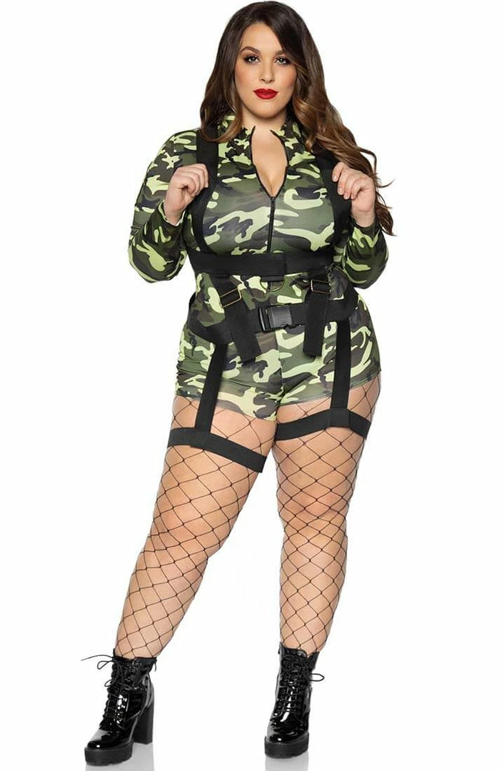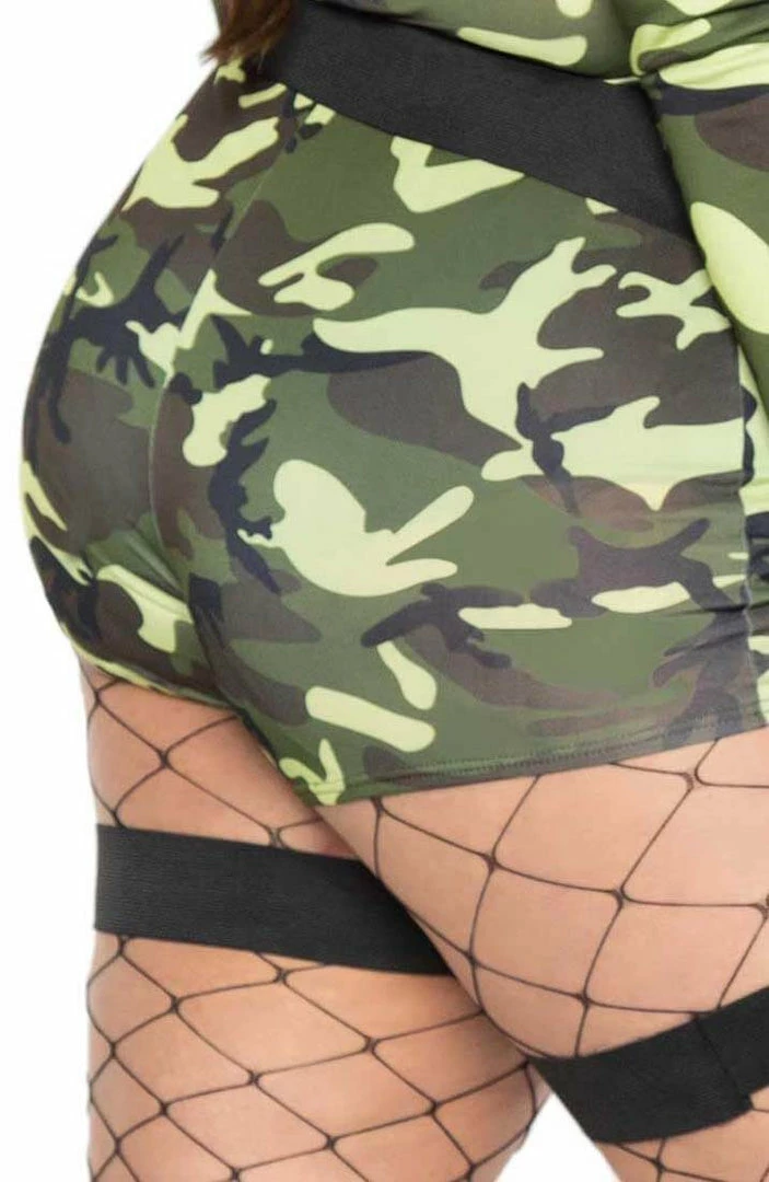 The military costume Goin’ Commando features a thight romper with small shorts and long sleeves, in true army and camouflage coloured spandex.